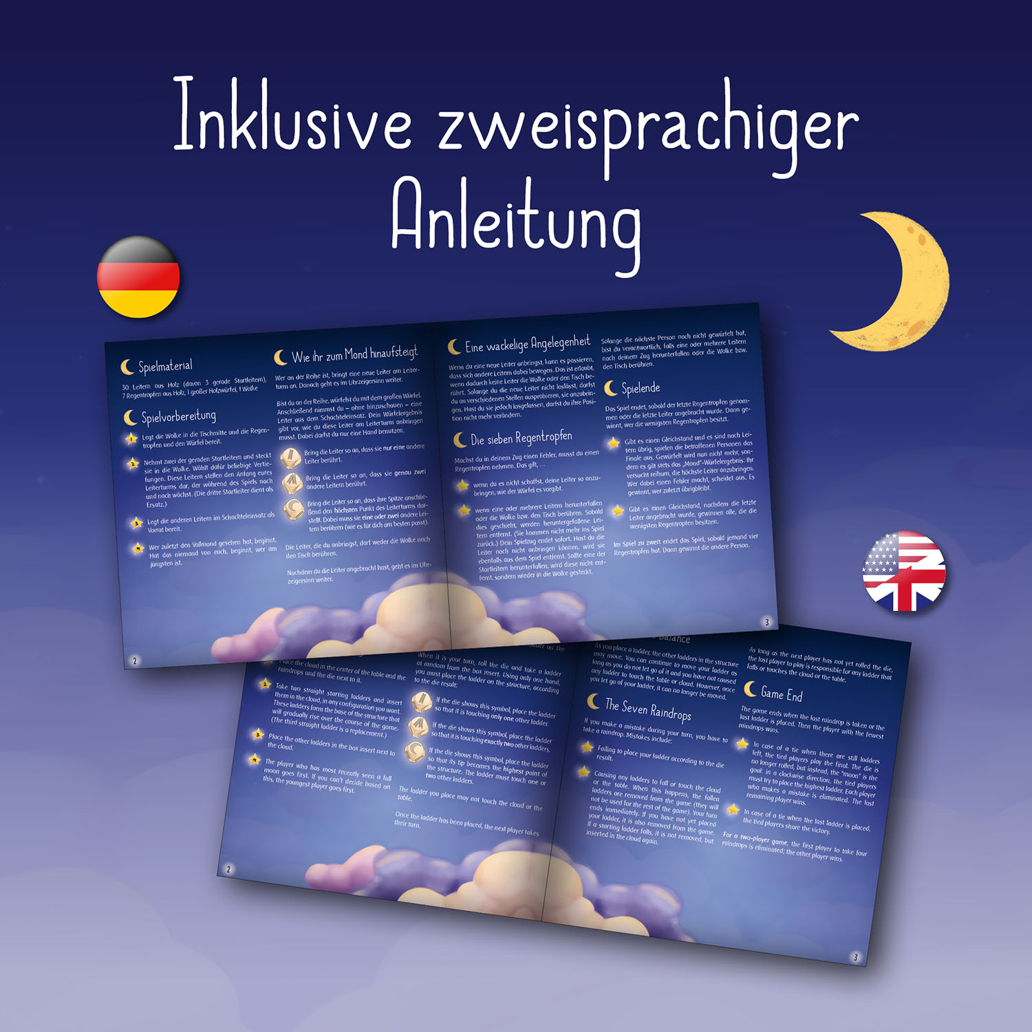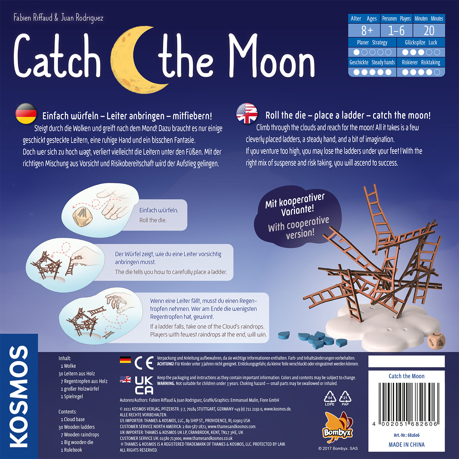 Ein spaßiges Geschicklichkeitsspiel für jung und alt. Gegeneinander oder gemeinsam spielen - Hauptsache hoch hinaus! Einfache Regel zum sofort mitspielen und viel Spielspaß. Bei diesem Spiel kommt jeder mal ins wackeln. Für 1-6 Spielerinnen und Spieler ab 8 Jahren. Hoch hinaus! Wem gelingt es, die höchste Leiter zu bauen und nach dem Mond zu greifen? Schnell sind die Regeln erklärt und es kann sofort mit dem Zusammenstecken der Leitern begonnen werden. Der Würfel gibt vor, wie die nächste Leiter auf kreative Weise am Leiterturm angebracht werden muss. Dazu benötigen die 1-6 Spielerinnen und Spieler ab 8 Jahren in diesem Geschicklichkeitsspiel ein wenig Glück, Fantasie und ein ruhiges Händchen. Doch wer sich zu hoch wagt riskiert, dass beim Anbauen etwas hinunterfällt. Dann kassiert man einen Regentropfen. Wer bis zum Spielende die wenigsten Regentropfen sammelt, gewinnt dieses aufregende Spiel. Ein cooles Geschicklichkeitsspiel mit viel Spaß für die ganze Familie.