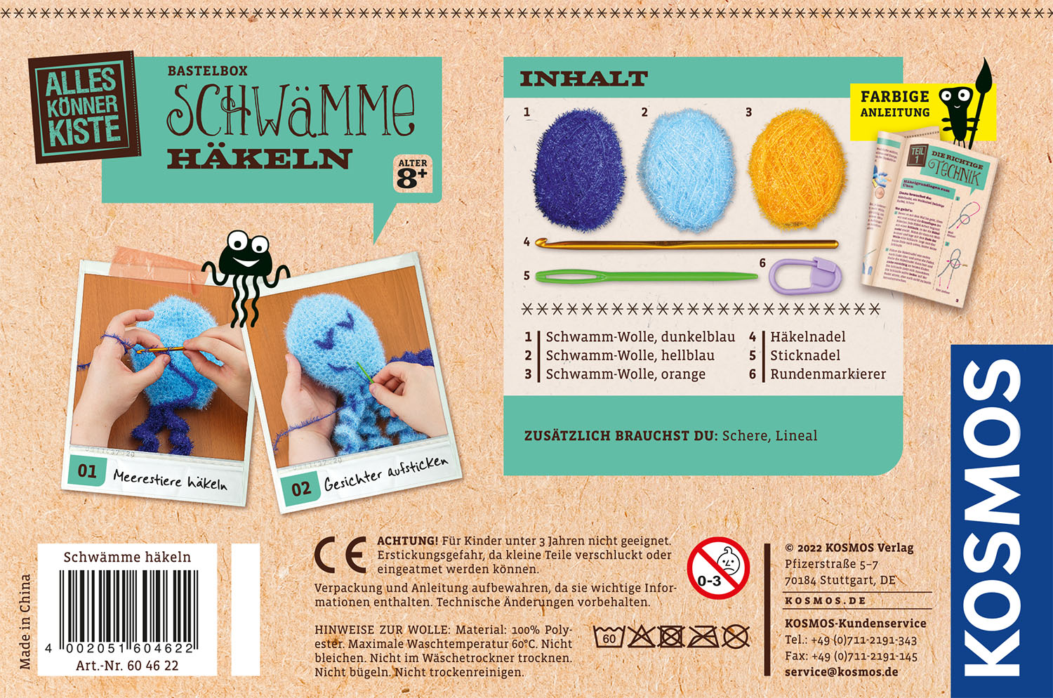 Hochwertiges Bastel-Komplett-Set mit besonderer Schwamm-Wolle und Häkelnadel. Tolle Häkelprojekte für Kinder ab 8 Jahren - für Anfänger und Fortgeschrittene. Handgroße Dusch-Schwämme in Meerestier-Form häkeln und individuell gestalten - Zum Planschen und Spielen! Mit der bebilderten Anleitung Schritt-für-Schritt kinderleicht die Grundtechniken des Häkelns lernen. Der praktische Rundenmarkierer hilft dabei, den Überblick zu behalten und erleichtert den Einstieg. Die spezielle Schwamm-Wolle ist bei 60°C waschbar und eignet sich daher perfekt für die lustigen Wassertiere! Badespaß mit selbst gemachten Schwämmen! Oktopus, Wal und Co. werden einfach aus der besonderen Schwamm-Wolle gehäkelt und direkt mit unter die Dusche genommen. Die ausführliche Anleitung leitet Kinder ab 8 Jahren mit vielen Bildern durch die einzelnen Häkel-Schritte, sodass die witzigen Meerestiere Masche für Masche gelingen. Der praktische Rundenmarker unterstützt Häkel-Anfänger und Fortgeschrittene. Neben den Grundtechniken des Häkelns verrät die Anleitung außerdem, wie lustige Gesichter gestaltet werden können. Einen Aufhänger häkeln, damit die Schwämme als tolle Deko im Bad hängen? Kein Problem! Jeder Badeschwamm kommt auch als Waschlappen zum Einsatz und ist bei 60 Grad waschbar!