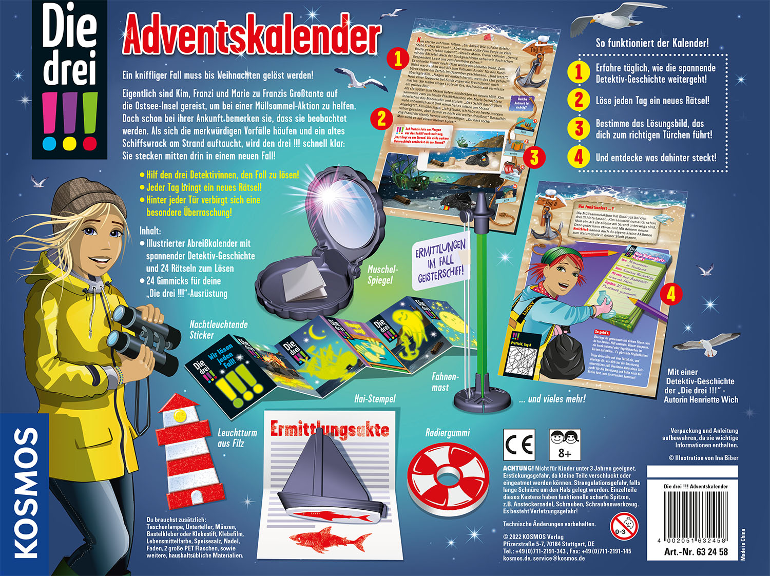 Adventskalender 2022 mit spannender Detektiv-Geschichte zum Knobeln. Besondere Mechanik: Jeden Tag muss ein Rätsel in der Geschichte gelöst werden, um das nächste Türchen zu finden. Die drei !!! ermitteln rund um ein mysteriöses Schiffswrack. Tolle Detektiv-Gadgets zum Sammeln. Super Geschenk für Hobbydetektive ab 8 Jahren. Großer Krimi-Spaß in der Adventszeit! Eigentlich sind Kim, Franzi und Marie an der Küste, um einer Umweltorganisation beim Müllsammeln zu helfen. Unvermittelt landen sie in einem aufregenden Fall! Genau zu dieser Zeit erwacht nämlich ein altes Schiffswrack in der Meeresbucht zum Leben. In der Nacht leuchten seltsame Lichter und das Wasser verfärbt sich grün. Was geht auf diesem seltsamen Schiff vor sich? Den Mädchen bleiben nur 24 Tage, um den Fall zu lösen! Bei ihren Ermittlungen werden Die drei !!! von Kindern ab 8 Jahren unterstützt. Um das richtige Türchen im Adventskalender zu finden, wird täglich ein spannendes Rätsel gelöst und das dazugehörige Lösungsbild gefunden. Es zeigt das richtige Türchen, hinter dem sich jeden Tag ein tolles Gadget verbirgt. So schnell war Weihnachten noch nie da!