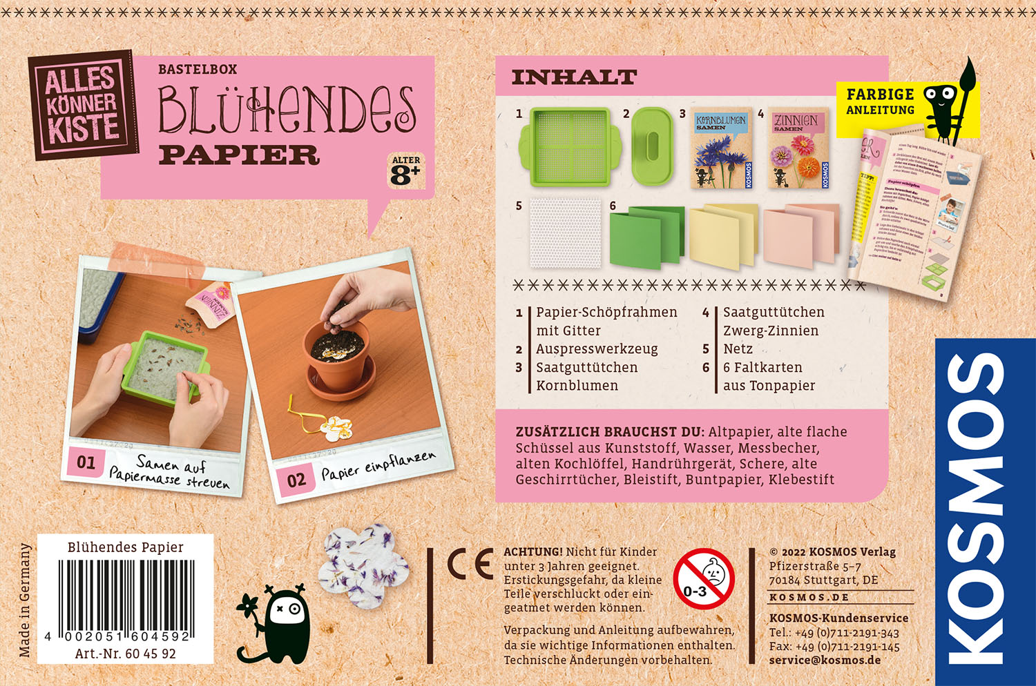 Wow! Mit dem Bastelset "Blühendes Papier von KOSMOS" Blumen aus Papier wachsen lassen. Hochwertige Materialien: Papier-Schöpfrahmen mit Gitter, Auspresswerkzeug, Netz, Saatguttütchen Kornblumen, Saatguttütchen Zwerg-Zinnien und 6 Faltkarten aus Tonpapier. Kreatives Recycling, das das Umweltbewusstsein stärkt. Großer Bastelspaß, der die Kreativität und Feinmotorik fördert. Vom Vorbereiten des Papierbreis bis zum Basteln mit dem fertig geschöpften Papier: altersgerechte Schritt-für-Schritt-Anleitung. DIY-Mitbringsel: Ein wunderbares Geschenk für Mädchen und Jungen ab 8 Jahren. Perfekt für Kindergeburtstage, den Urlaub und Bastelnachmittage mit Freunden, Geschwistern und Familie. Aus dem selbst gemachten Papier entstehen individuelle Geschenke für Familie und Freunde. Aus Altpapier und Wasser werden mithilfe des Schöpfrahmens kleine Naturpapier-Quadrate geschöpft und mit Blumensamen bestreut. Aus dem fertigen Papier können Kärtchen, Geschenk-Anhänger und vieles mehr gefertigt werden. Und der Clou: Pflanzt man das Papier in Erde und gießt es regelmäßig, kann man sich bald über ein Blütenmeer freuen.