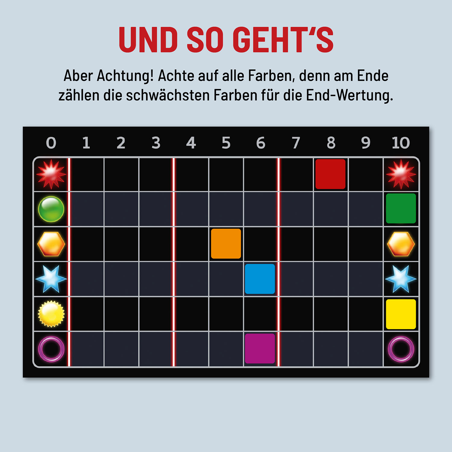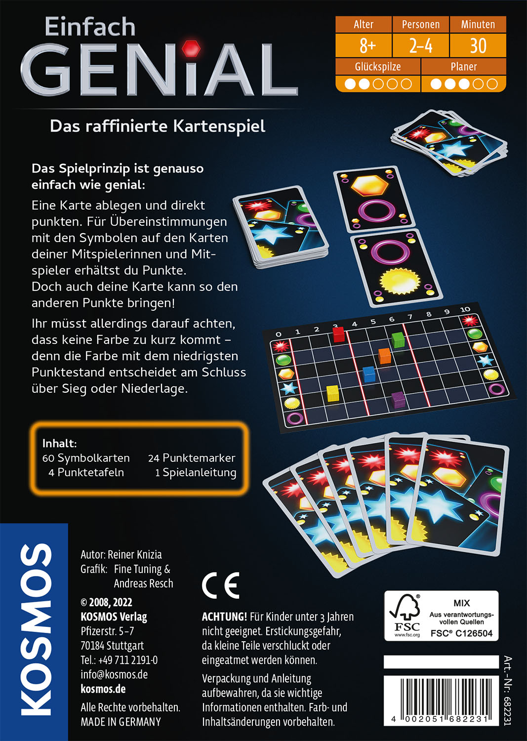 Fesselndes Kartenspiel zum Einfach Genial Prinzip. Immer wieder spannend - bis zu zur letzten Sekunde. Genial einfach - kurze Regeln zum direkt losspielen. Für 2-4 Spielerinnen und Spieler. Spannender Spielspaß für jung und alt ab 7 Jahren. Das neue Lieblingspiel für zwischendurch oder für unterwegs in unter 20 Minuten gespielt. Der beliebte Bestseller - jetzt als fesselndes Kartenspiel. Das Spielprinzip ist genauso einfach wie genial: Eine Karte ablegen und genial punkten. Für Übereinstimmungen mit den Karten der MitspielerInnen gibt es Siegpunkte. Aber die MitspielerInnen können ihre Karten ebenso nutzen. Da heißt es wachsam sein! Wunderbar einfach und genial spannend.
