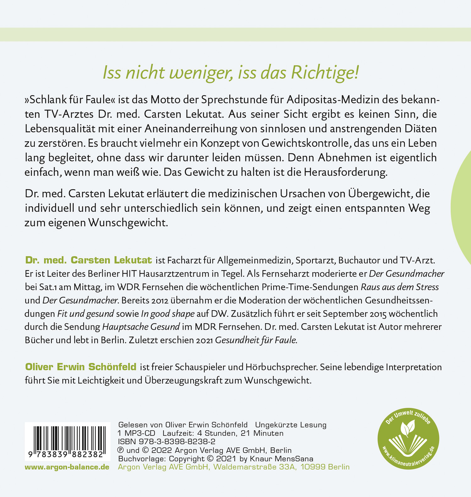 »Iss nicht weniger, iss das Richtige«, lautet das Motto der Sprechstunde für Adipositas-Medizin des bekannten TV-Arztes Dr. Carsten Lekutat. Aus seiner Sicht ergibt es keinen Sinn, die Lebensqualität mit einer Aneinanderreihung von nutzlosen und anstrengenden Diäten zu zerstören. Es braucht vielmehr ein individuell abgestimmtes Konzept, das uns lebenslang begleitet. Denn Abnehmen ist eigentlich einfach, wenn wir wissen, wie. Das Gewicht zu halten, ist die Herausforderung.