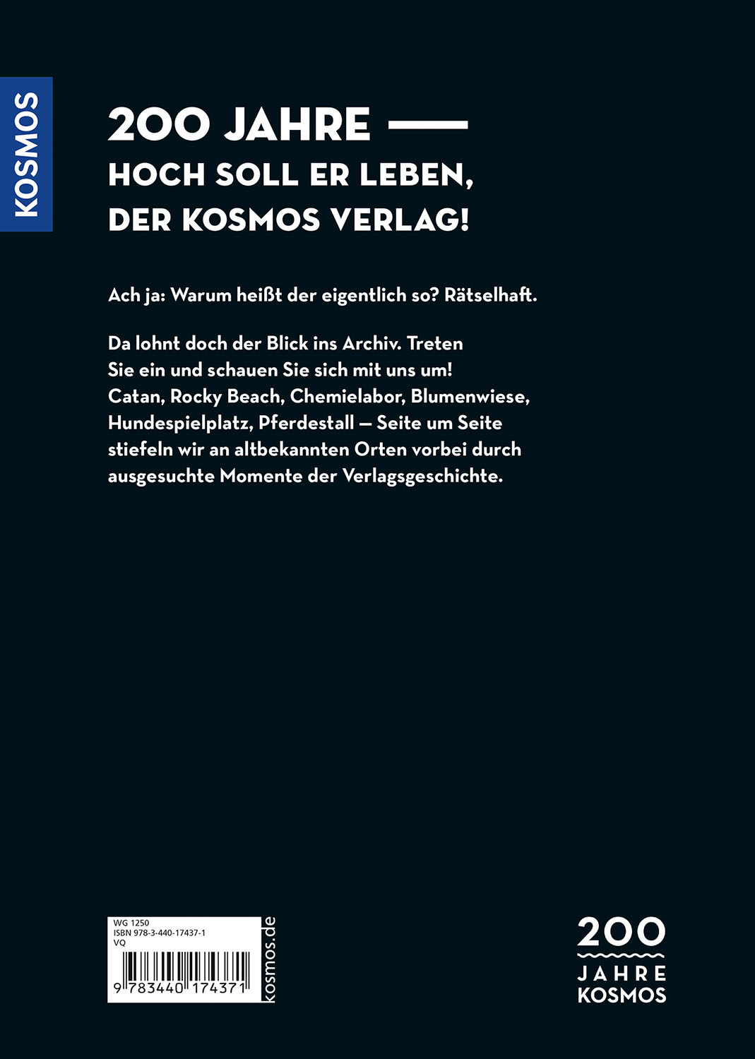 200 Jahre Kosmos Verlag: Hoch soll er leben! Aber warum heißt der eigentlich so? Rätselhaft ... Da lohnt doch der Blick die Vergangenheit. Maus Irmela und Zweibeinerin Anja treffen sich im Kosmos-Archiv. Die grundlegende Frage: Wer oder was ist eigentlich Kosmos und was machen die überhaupt? Beim Stöbern in dem rätselhaften Archiv begegnen ihnen Menschen, Ideen und Produkte, die 200 Jahre Kosmos geprägt haben und es teils heute noch tun. Catan, Rocky Beach, Chemielabor, Blumenwiese, Hundespielplatz, Pferdestall: Seite um Seite streifen die beiden an altbekannten Orten vorbei durch die bewegte Geschichte des Verlags. Auf fesselnden Bildern und in temporeichen, witzigen Dialogen werden die Meilensteine lebendig - von den Brüdern Franckh bis Aiga Rasch, vom Himmelsjahr bis Catan.