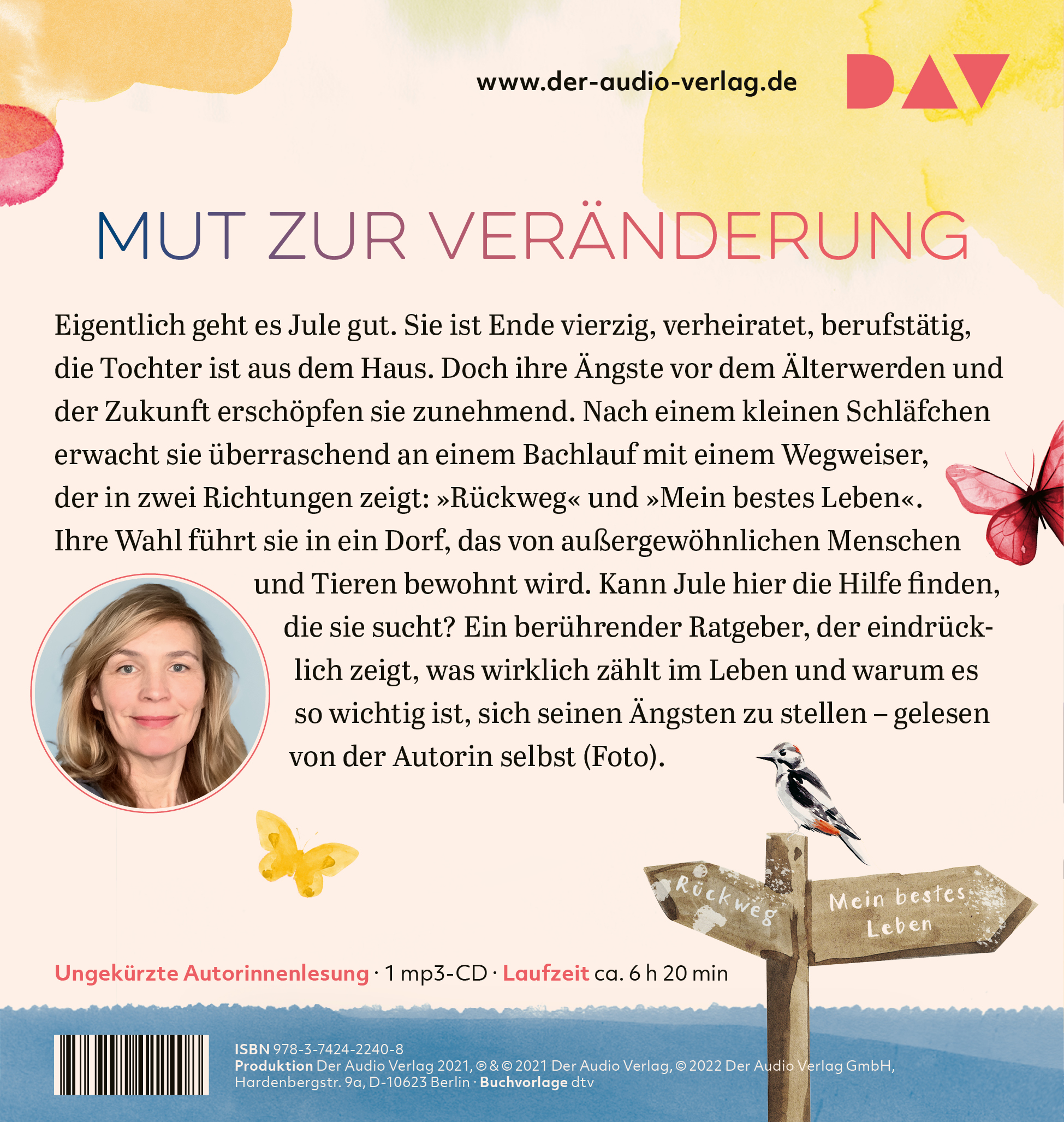 Eigentlich geht es Jule gut. Sie ist Ende vierzig, verheiratet, berufstätig, die Tochter ist aus dem Haus. Doch ihre Ängste vor dem Älterwerden und der Zukunft erschöpfen sie zunehmend. Nach einem kleinen Schläfchen erwacht sie überraschend an einem Bachlauf mit einem Wegweiser, der in zwei Richtungen zeigt: »Rückweg« und »Mein bestes Leben«. Ihre Wahl führt sie in ein Dorf, das von außergewöhnlichen Menschen und Tieren bewohnt wird. Kann Jule hier die Hilfe finden, die sie sucht? Ein berührender Ratgeber, der eindrücklich zeigt, was wirklich zählt im Leben und warum es so wichtig ist, sich seinen Ängsten zu stellen.Ungekürzte Autorinnenlesung mit Michaela Wiebusch1 mp3-CD | ca. 6 h 15 min
