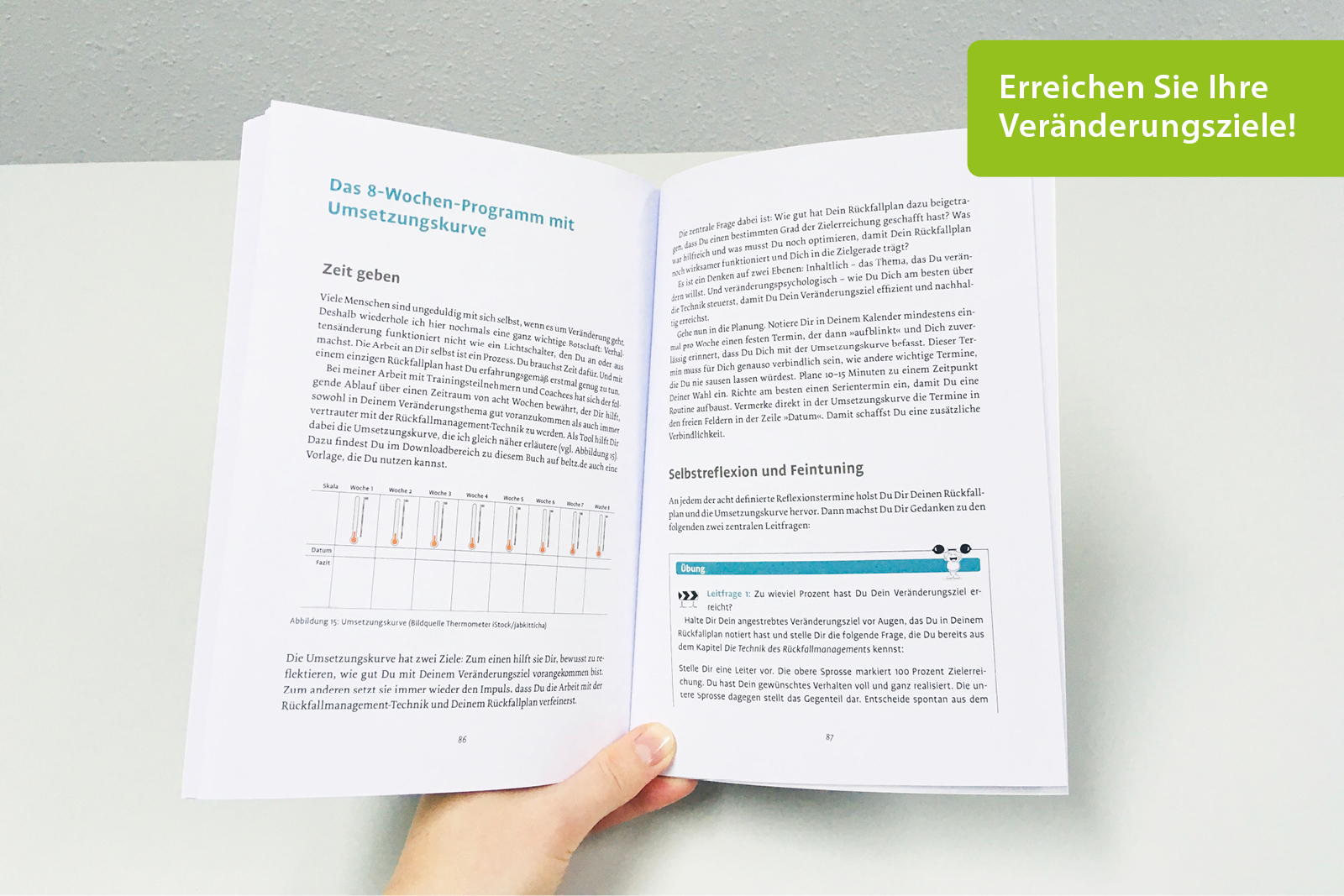 | Schlagworte | 8 Wochen Programm • Coaching Material • Die 1% Methode • Gewohnheiten ändern • Leitfaden • Lerntransfer • Motivation • Reinschreibbuch • Rückfallplan • Transferstärke • Trigger • Veränderung • Verhaltensänderung |