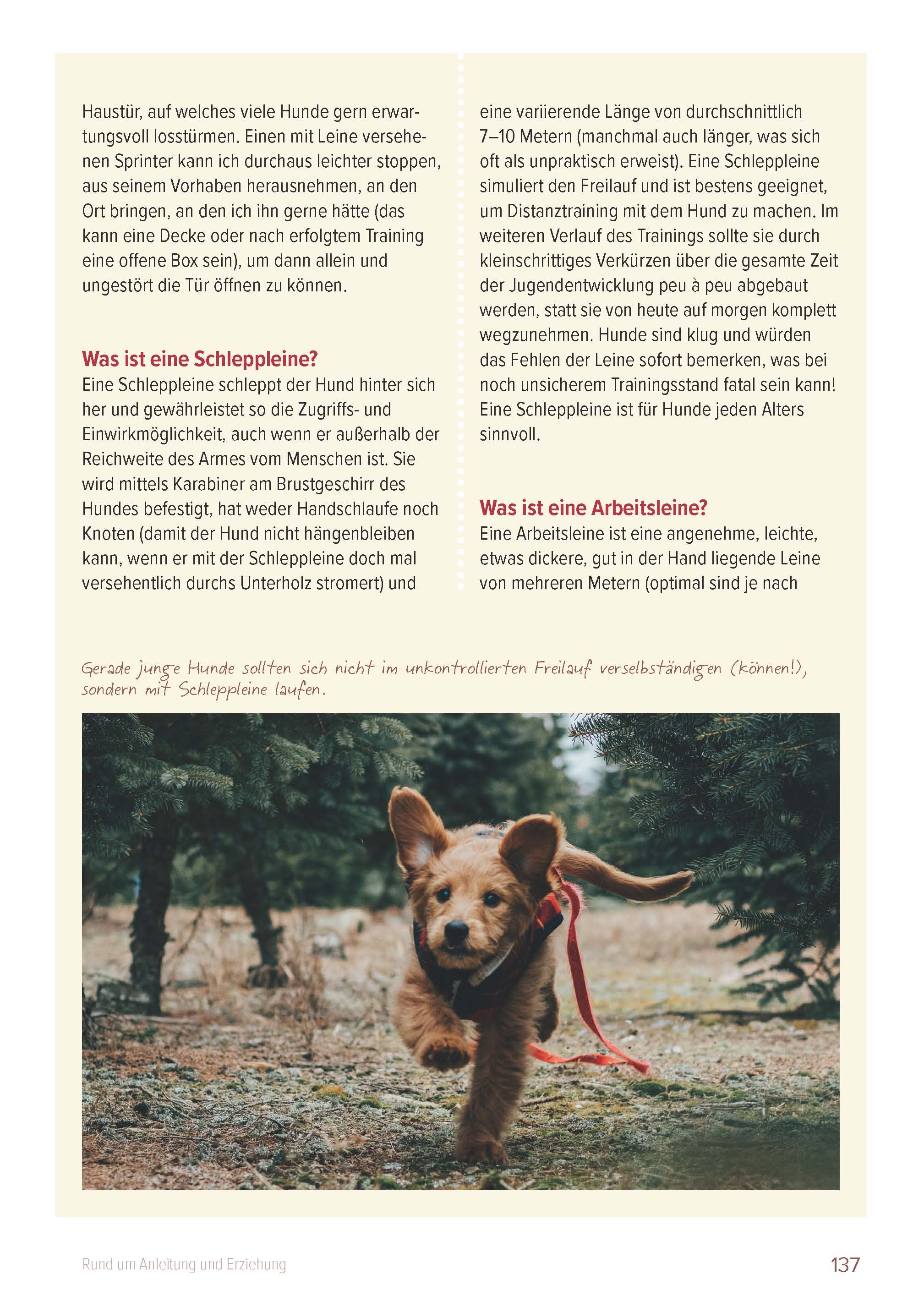 | Schlagworte | Ablenkung • Akustisches Signal • Aussteigen aus dem Auto • Begegnungen • Begrüßung • Belohnen • Beschäftigen • Clicker • Erziehungsprogramm • Formen • Futterbeutel • Gegenkonditionierung • Geschirre • Halsbänder • Herankommen • Hilfsmittel • Hund • Hundeerziehung • hundeplatz • Ignorieren • Konditionierung • Konfliktvermeidung • Konsequenz • Körpersprache • Leine • Leine laufen • Leinenführigkeit • Lernen • Lernen durch Zuschauen • Lernkette • Lernumgebung • Lernverhalten • Lernziel • Nachahmen • Nachfolgen • Nein • optisches Signal • Platz • Positive Verstärkung • Schleppleine • Shaping • sicherer Rückruf • Sitz • Steh • Strafen • taktiles Signal • Timing • Verstärkung • Warten • Welpe |