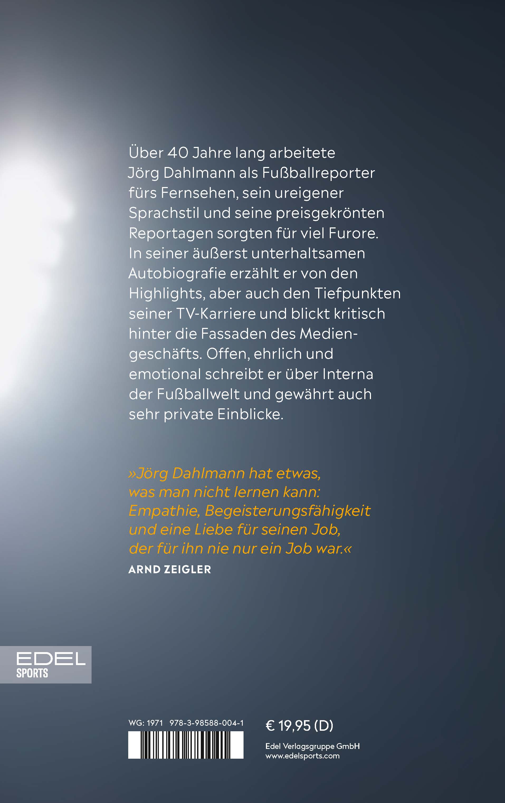 Jörg Dahlmann, geboren 1959 in Gelsenkirchen, lernte Journalismus von der Pieke auf. Nach Zivildienst, Volontariat undStudium begann er beim ZDF als Fußballreporter.Jahrzehntelang berichtete er für verschiedene TV-Sender aus der Bundesliga undder Champions League, von Welt- und Europameisterschaften und Olympischen Spielen.Jörg Dahlmann hat drei Krebserkrankungen überstanden und engagiert sich für die Deutsche Krebshilfe. Er ist Botschafter für die Initiative »Respekt! Kein Platz für Rassismus«. Heute lebt er auf Mallorca und in Wiesbaden.