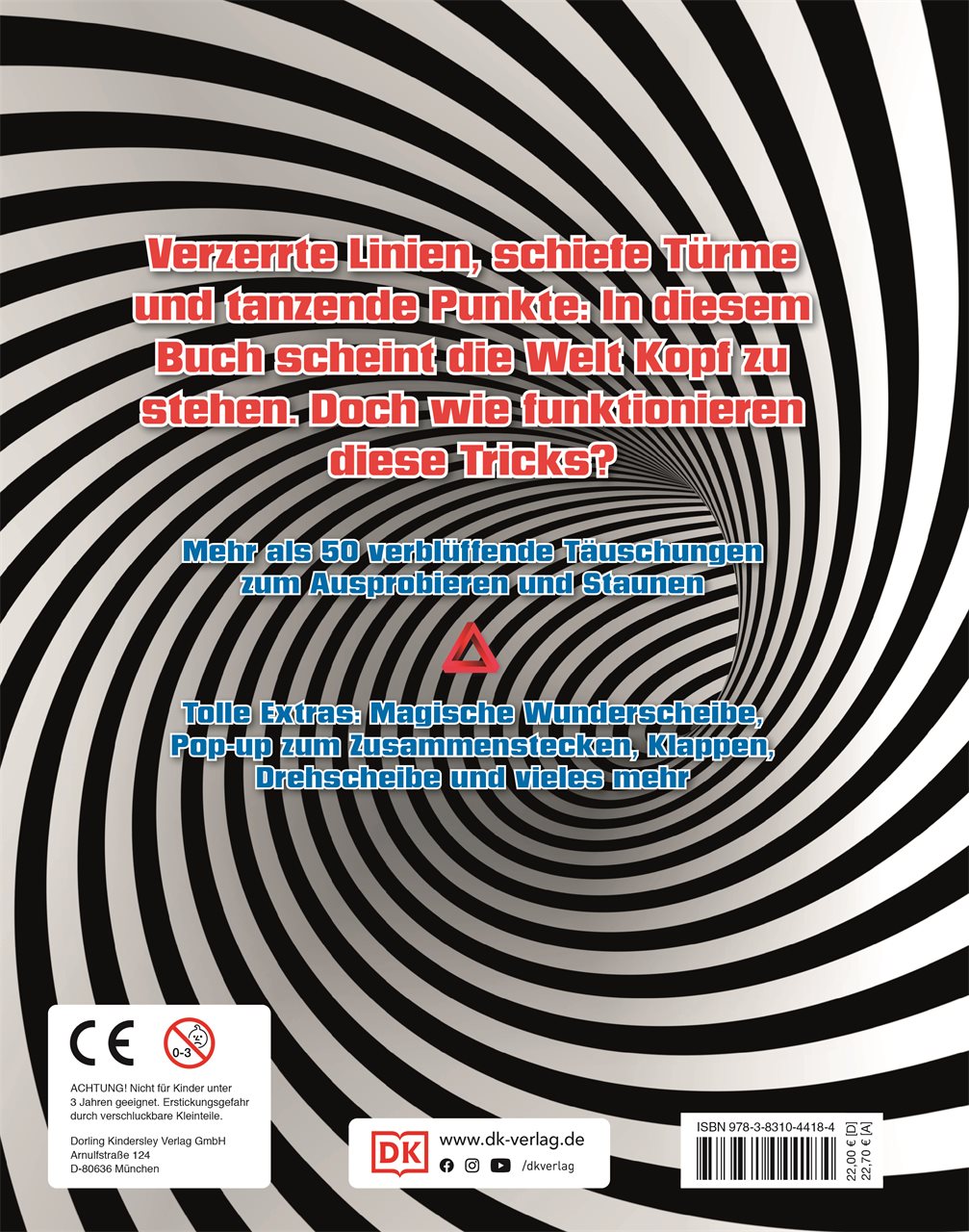 | Schlagworte | 3-D-Bilder • Hintergrundwissen Optische Täuschungen • Illusion Buch • Illusionen fürs Auge • Optik • Optische Illusion • Optische Illusion erklärt • Optische Phänomene • Optische Täuschung • optische Täuschung Buch • Optische Täuschungen für Kinder • Trickbilder • Wie funktionieren optische Täuschungen |