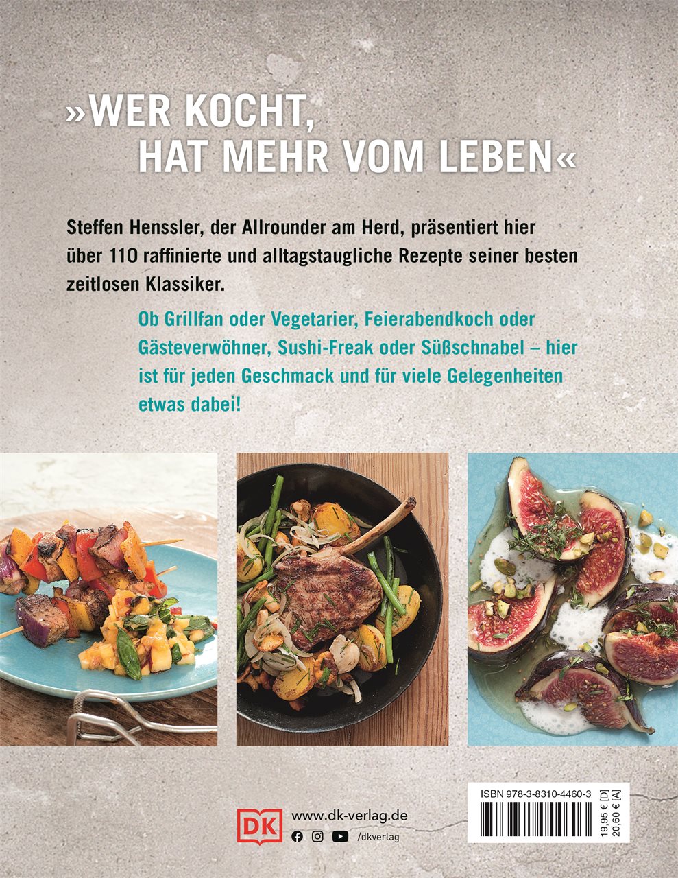- Die beliebtesten Klassiker aus Steffen Hensslers Küche: Hähnchenspieß mit Kokos-Kartoffelpüree, Sashimi-Salat, Süßkartoffel-Chili-Suppe mit gegrillten Zucchinispießen, Käse vom Grill mit Traubenkompott, Mohn-Cheesecake und viele weitere Köstlichkeiten.