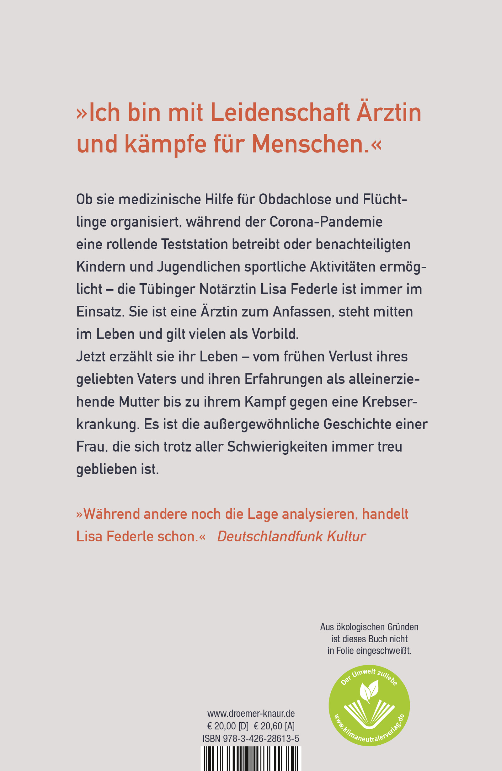 Handeln, um zu helfen, das ist ihr Lebensmotto. Lisa Federle gilt mittlerweile vielen als tatkräftige Frau, die mitten im Leben steht, die sich immer durchkämpfen musste, die die Probleme mutig und wenn es sein muss unkonventionell angeht und dabei nie den Menschen aus dem Blick verliert. Für ihr soziales Engagement wurde die Notärztin 2020 mit dem Bundesverdienstkreuz ausgezeichnet.