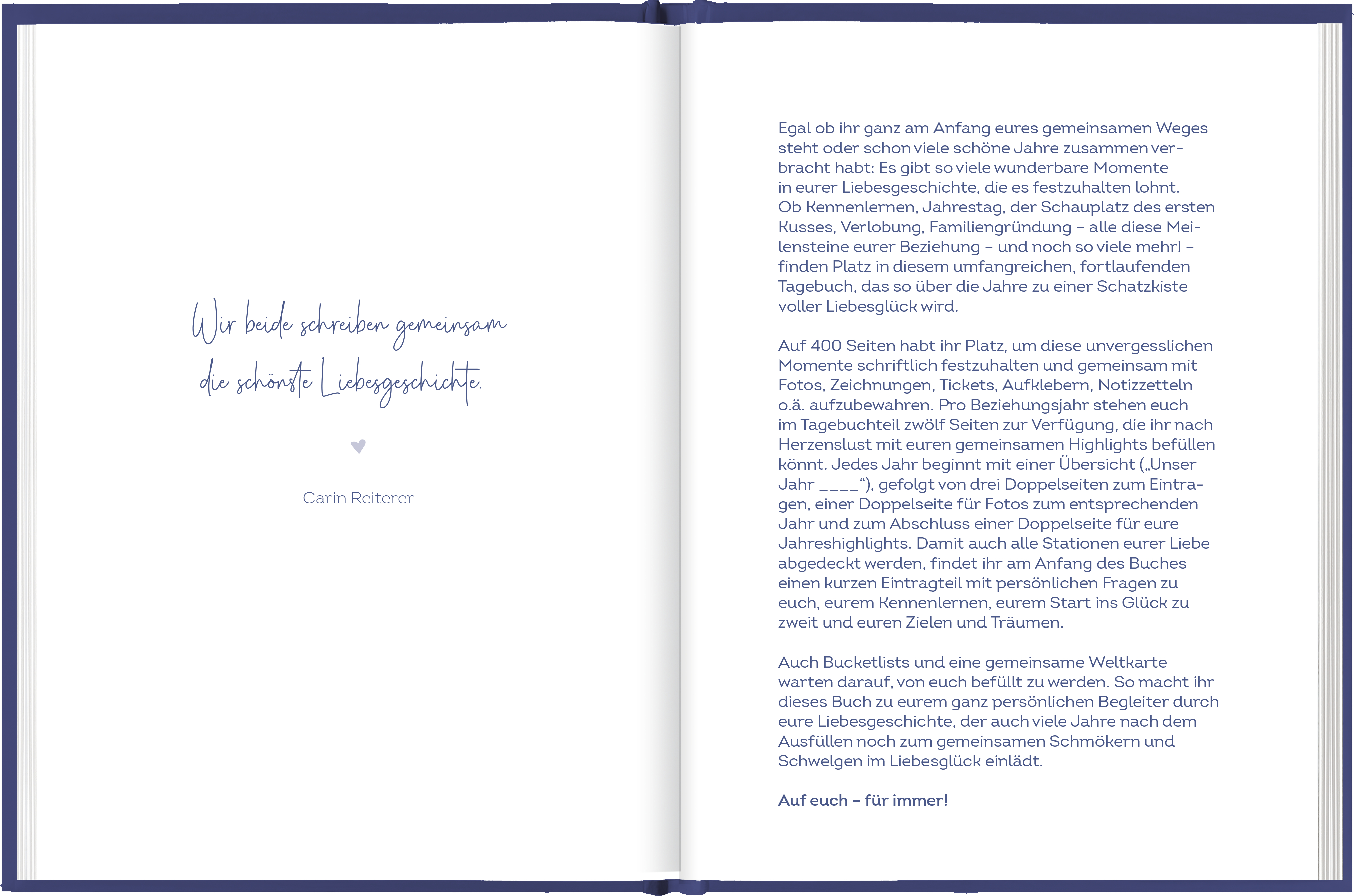 Auf 400 Seiten bietet das Paar-Tagebuch viel Platz, die Geschichte eurer Liebe festzuhalten: Vom Kennenlernen über Verlobung, Hochzeit, gemeinsame Urlaube, Umzüge, Jahrestage und alle anderen Highlights eurer Beziehung. In das stabile Tagebuch können auch Fotos, Tickets oder Aufkleber eingeklebt werden. So entsteht über die Jahre eine wertvolle Sammlung eurer gemeinsamen Erinnerungen als Paar, in der ihr immer wieder schmökern und schwelgen könnt. Das edle Tagebuch für Paare ist auch ein schönes Geschenk für Brautpaare zur Hochzeit, an dem beide Partner jahrelang Freude haben.