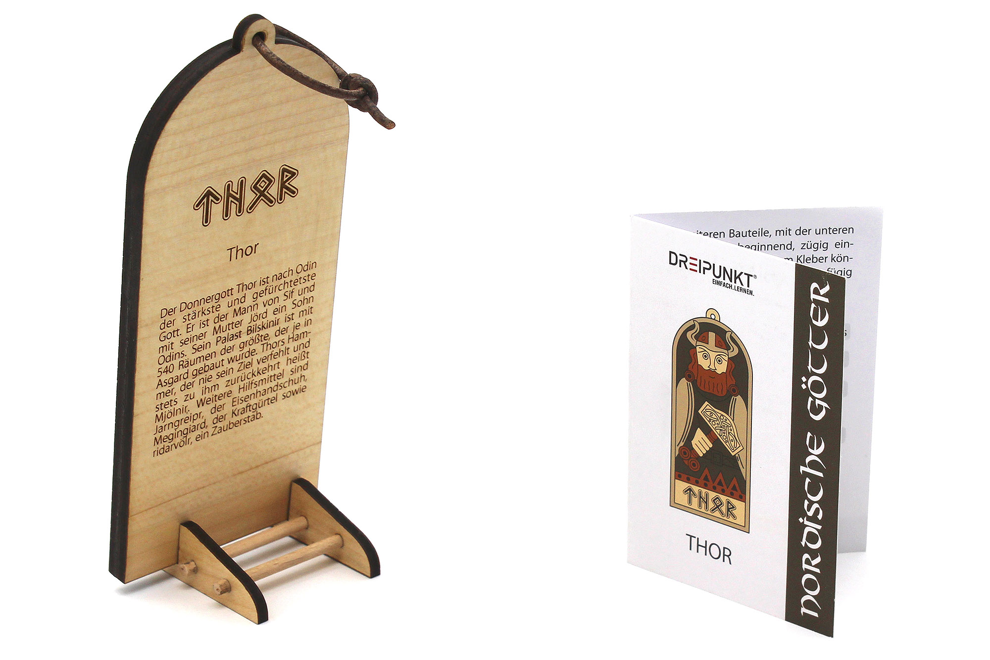 Mit diesem detailliert gearbeiteten Amulett aus Edelholz (MDF mit Edelholzfurnier) hast du einen der bekanntesten und beliebtesten Götter der nordischen Mythologie immer bei dir. Nach dem Zusammenbau kannst du das Amulett entweder mit dem mitgelieferten Lederband als Anhänger verwenden oder auf dem ebenfalls enthaltenen Präsentationsständer aufstellen. Die Vorderseite zeigt eine dekorative Darstellung des Gottes Thor mit dem Namen in Runenschrift. Auf der Rückseite findest du Informationen zu den Eigenschaften und dem Leben von Thor. Mit bebilderter Anleitung, Lederband sowie einem Präsentationsständer! Bausatz Inhalt - Holz-Bauteile aus Eichen-, Ahorn-, Kirsch- und Walnussholz (MDF mit Furnier für größtmögliche Stabilität), lasergeschnitten und teilweise graviert - Rundstab 3mm aus Buche - Bebilderte Bauanleitung Zum Zusammenbau wird kein Werkzeug benötigt. Bei Problemen beim Zusammenbau steht dir unser Modellbau-Team per eMail unter bauberatung@dreipunkt-verlag.de zur Verfügung.