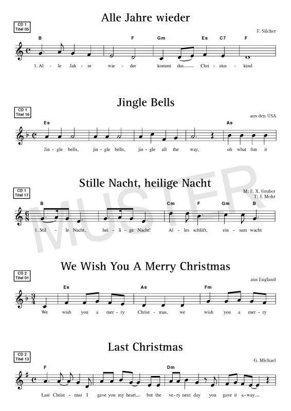 SO A SCHLITTENFAHRT - SCHüRZENJäGER / A WEIHNACHT, WIE'S FRüHER WAR - SCHüRZENJäGER / ALLE JAHRE WIEDER - TRADITIONELL / AMEN - TRADITIONELL / AN DAS POSTAMT WOLKE 7 - STEFANIE HERTEL / BAJUSCHKI BAJU - TRADITIONELL / ENGEL HABEN HIMMELSLIEDER - TRADITIONELL / ES IST EIN ROS' ENTSPRUNGEN - TRADITIONELL / ES IST FüR UNS EINE ZEIT ANGEKOMMEN - TRADITIONELL / ES WIRD SCHO GLEI DUMPA - TRADITIONELL / FELIZ NAVIDAD - JOSE FELICIANO / FREU DICH, ERD UND STERNENZELT - TRADITIONELL / FRöHLICHE WEIHNACHT üBERALL - TRADITIONELL / GO TELL IT ON THE MOUNTAIN - TRADITIONELL / HARK! THE HERALD ANGELS SING - TRADITIONELL / HEIDSCHI, BUMBEIDSCHI - TRADITIONELL / HERBEI, O IHR GLäUB´GEN - TRADITIONELL / IHR KINDERLEIN KOMMET - TRADITIONELL / JINGLE BELLS - TRADITIONELL / JOY TO THE WORLD - TRADITIONELL / KLING, GLöCKCHEN - TRADITIONELL / KOMM LASS UNS TRäUMEN - CHARLY BETZ / KOMMET, IHR HIRTEN - TRADITIONELL / LAßT UNS FROH UND MUNTER SEIN - TRADITIONELL / LAST CHRISTMAS - WHAM / LEISE RIESELT DER SCHNEE - TRADITIONELL / LET IT SNOW! - TRADITIONELL / MARY'S BOYCHILD - TRADITIONELL / MORGEN, KINDER, WIRD'S WAS GEBEN - TRADITIONELL / MORGEN KOMMT DER WEIHNACHTSMANN - TRADITIONELL / O DU FRöHLICHE - TRADITIONELL / O TANNENBAUM - TRADITIONELL / RUDOLPH, THE RED-NOSED REINDEER - TRADITIONELL / SANTA CLAUS IS COMING TO TOWN - GLENN MILLER / SCHNEEFLöCKCHEN, WEIßRöCKCHEN - TRADITIONELL / SCHöNE WEIHNACHTSZEIT - NüRNBERGER CRISTKINDLES CHOR / STILLE NACHT, HEILIGE NACHT - TRADITIONELL / STOP THE CAVALERY - JONA LEWIE / SüßER DIE GLOCKEN NIE KLINGEN - TRADITIONELL / THE CHRISTMAS SONG - TRADITIONELL / THE LITTLE DRUMMER BOY - TRADITIONELL / VOM HIMMEL HOCH DA KOMM ICH HER - TRADITIONELL / WE WISH YOU A MERRY CHRISTMAS - TRADITIONELL / WINTER WONDERLAND - TRADITIONELL / ZU BETLEHEM GEBOREN - TRADITIONELL