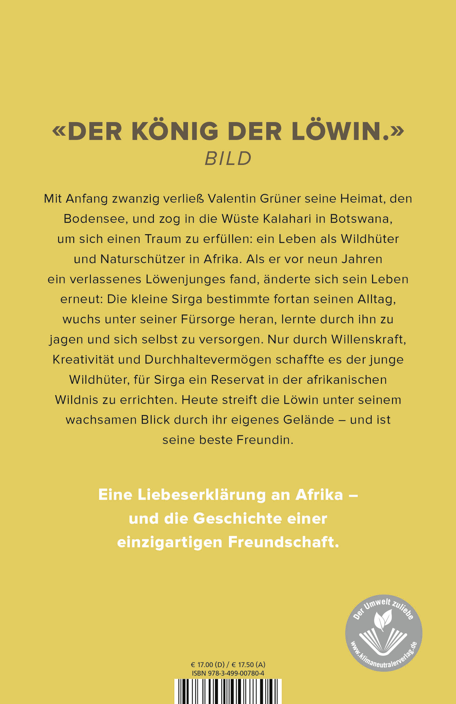 lt;p>Valentin Grüner lebt den Traum vieler Menschen: Mit Anfang 20 gab er seine Heimat, den Bodensee, für ein Leben als Wildhüter und Naturschützer in Afrika auf und zog in die Wüste Kalahari in Botswana. Als er vor neun Jahren ein verlassenes Löwenjunges fand, änderte sich alles: Die kleine Sirga bestimmte fortan seinen Alltag, wuchs heran, lernte auf Streifzügen, mit Valentin zu jagen und sich selbst zu versorgen. Nur durch Willenskraft, Kreativität und Durchhaltevermögen schaffte es Valentin, für Sirga ein Reservat in der afrikanischen Wildnis zu errichten. Nun streift Sirga unter Valentins wachsamem Blick durch ihr eigenes Gelände. In seinem Buch erzählt Valentin Grüner von seiner abenteuerlichen Geschichte - und der Freundschaft zu der Löwin Sirga.