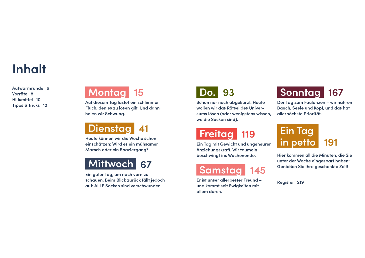 Jeden Abend stellt sich die gleiche Frage: Was soll ich heute bloß kochen? Mit diesem praktischen Kochbuch lässt sich diese tägliche Aufgabe auf lockere Art meistern. Da jeder Tag anders ist, orientiert es sich an den Wochentagen und seinen Energielevels: Ob man am Montag voller Elan startet, am Mittwoch ein leckeres Faulenzergericht gegen das Wochentief zubereitet oder am Sonntag gemütlich zu Brunch und Linner einlädt - 100 Rezepte bringen Spaß, Einfachheit und frische Ideen in den täglichen Trott. Denn der Alltag ist schon stressig genug.