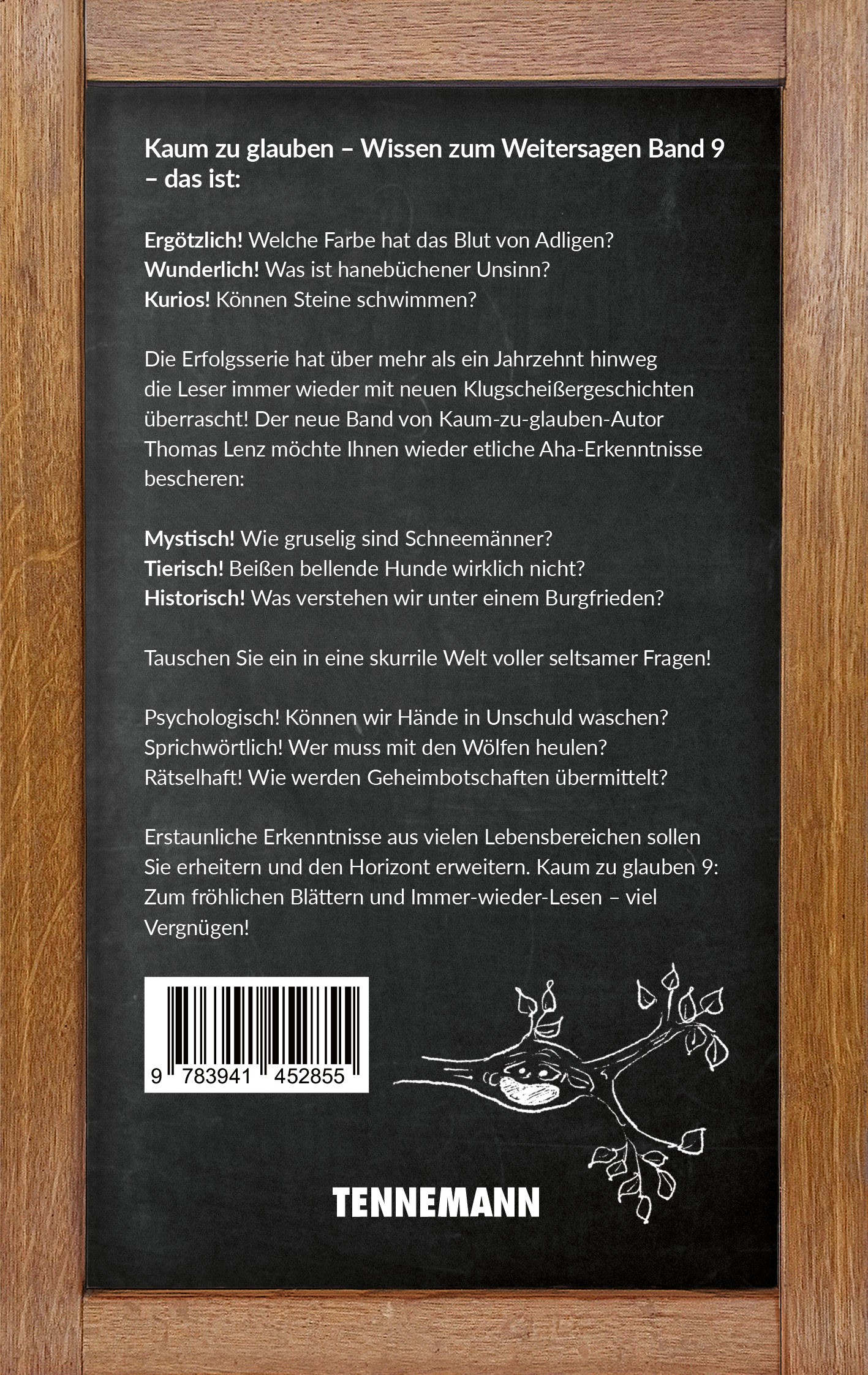 Lieber Leser! Wissen Sie, wer wirklich Dreck am Stecken hat? Kennen Sie die giftigste Substanz der Welt? Und haben Sie sich mal gefragt, ob sich Fliegen vor dem Essen die Hände waschen? Antworten auf diese und viele weitere kuriose Fragen bietet der neue Band von Kaum zu glauben – Wissen zum Weitersagen. Was hat ein Vatermörder in der Mode zu suchen? Was ist Schall und Rausch? Und mit wem kann man Pferde stehlen? Mit gewohnt spitzer Feder hat Kaum-zu-glauben-Autor Thomas Lenz wieder 160 unterhaltsame Klugscheißergeschichten aus vielen Lebensbereichen zusammengetragen: Seit wann legen Hasen Ostereier? Was hat es mit der englischen Teatime auf sich? Und wer ist mit allen Wassern gewaschen? Die Antworten finden Sie in diesem Buch! Weit über dreitausend einzelne, augenzwinkernde Kaum-zu-glauben-Fragen gibt es mittlerweile, natürlich mit den entsprechenden, meist überraschenden Antworten! Die besten haben wir auch für den vorliegenden 9. Band wieder ausgewählt. Ich wünsche Ihnen von Herzen gute Unterhaltung, viel Vergnügen und das eine oder andere Aha-Erlebnis beim Lesen von Kaum zu glauben – Band 9! Ihr Leif Tennemann