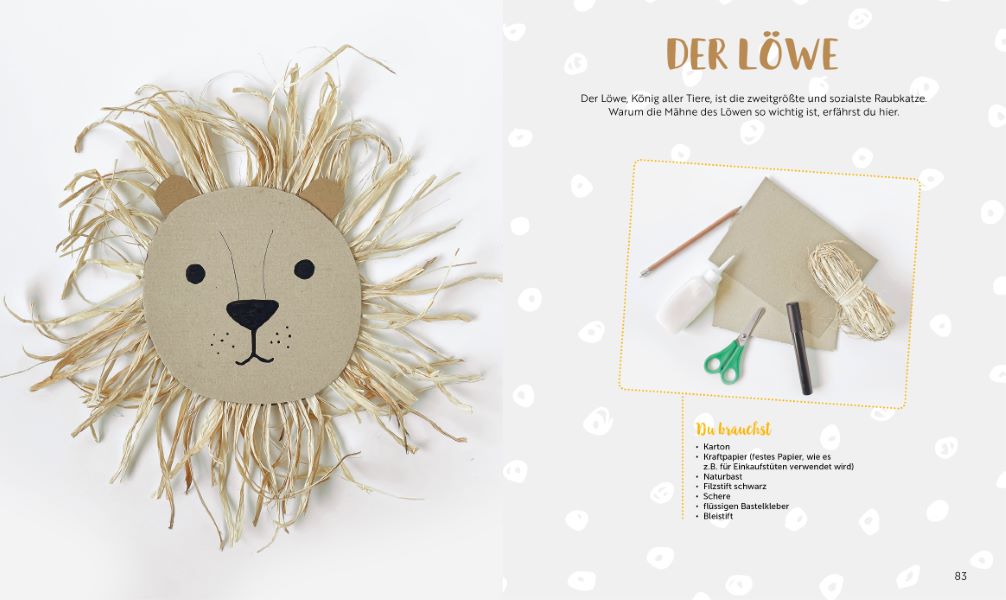 Hilf dem Zebra, seine Streifen wieder zu finden, und tauche mit dem Anglerfisch in die Tiefen des Meeres. Mit den Schritt-für-Schritt-Anleitungen entstehen tolle Spiele und bunte Basteleien, die die Geduld, Feinmotorik und Augen-Hand-Koordination der Kinder fördern. Und nebenher lernen die kleinen Künstlerinnen und Künstler spielerisch zahlreiche spannende Fakten über den Lebensraum und die Merkmale der Tiere kennen.