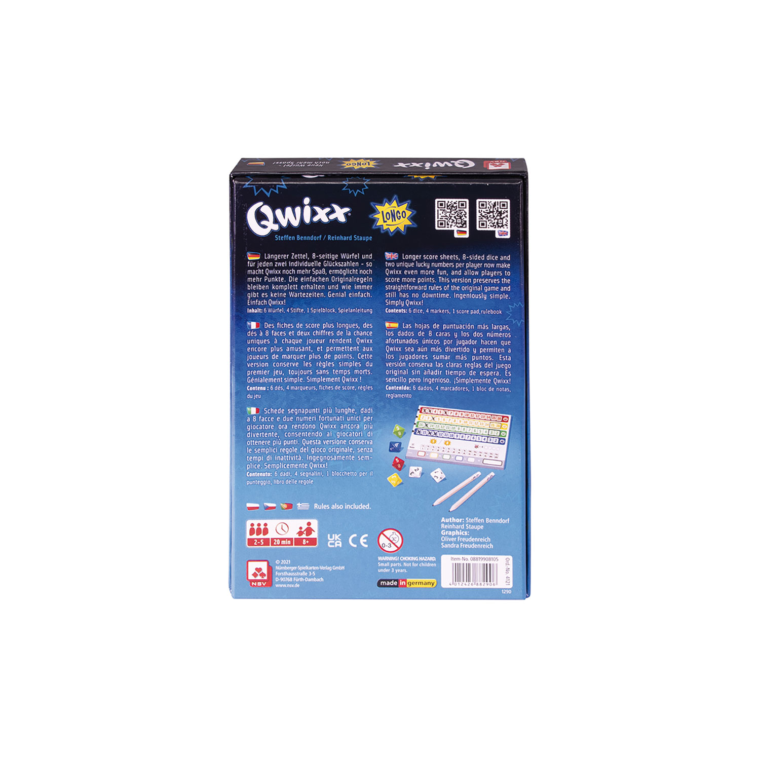 | Schlagworte | Achtseitig • Familie • Familienspiel • Gesellschaftsspiel • Glückszahl • Made in Germany • Mehrspieler • Nürnberger Spielkarten Verlag GmbH • Roll & Write • schnelles spiel • Spieleabend • W8 • Würfel • Würfelspiel |