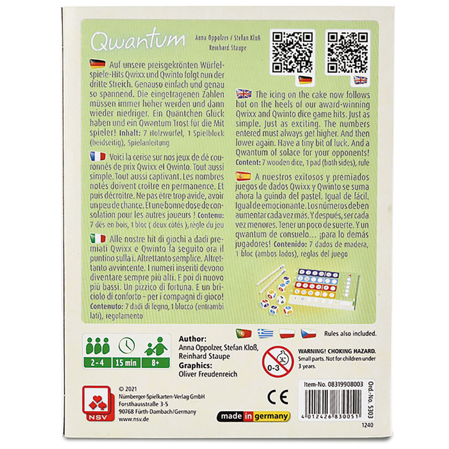 | Schlagworte | Familie • Familienspiel • FSC • Gesellschaftsspiel • kein Plastik • Made in Germany • Mehrspieler • no plastic • Nürnberger Spielkarten Verlag GmbH • Qwinto • Qwixx • Recyclingpapier • Roll & Write • schnelles spiel • Spieleabend • Würfel • Würfelspiel |