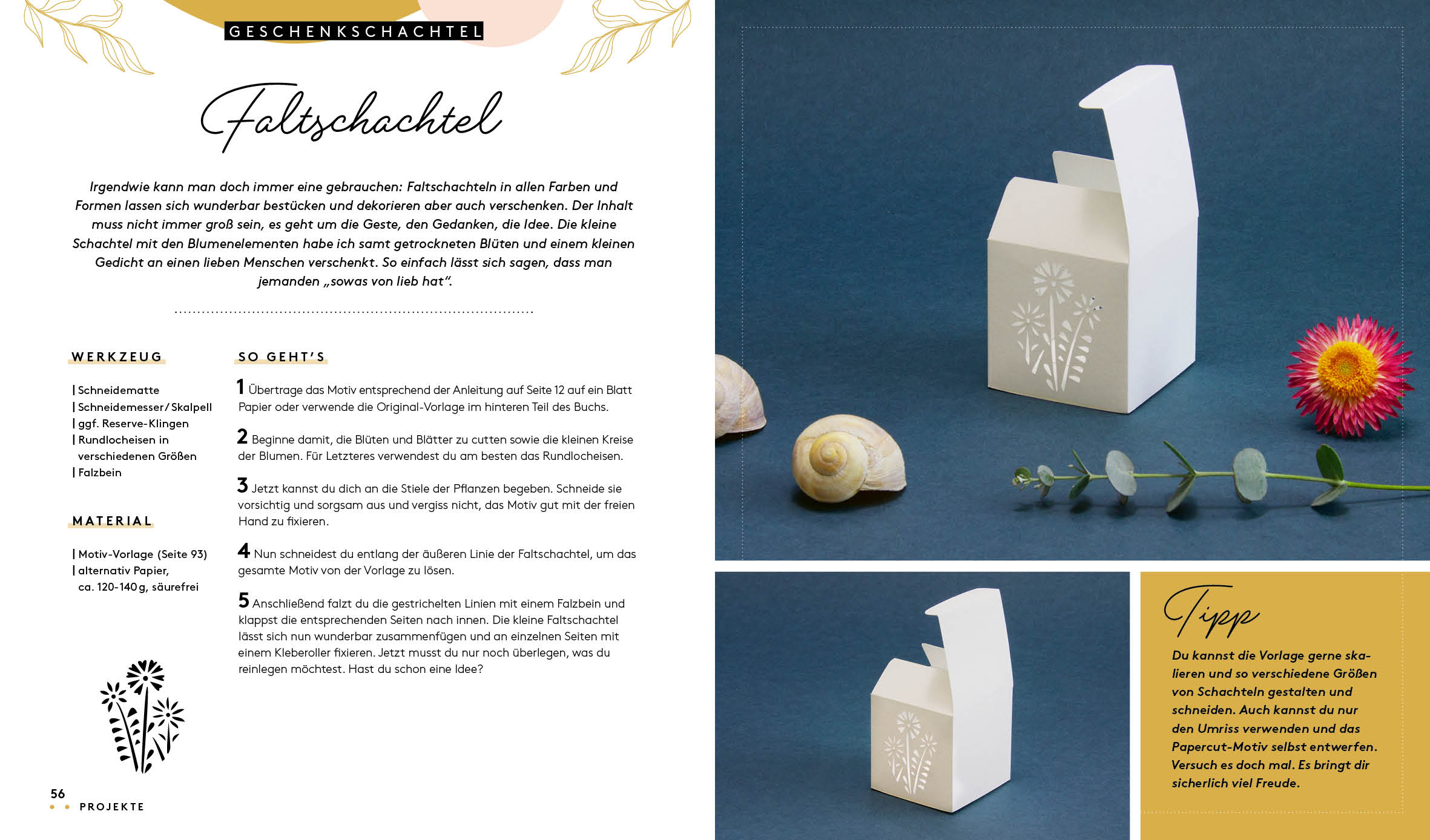 Dieses Buch beinhaltet alles, was man für den Einstieg in die Kunst des Papercuts braucht: Schneide-Tipps, Grundlagenwissen zu Papier und Werkzeug und bezaubernde DIY-Projekte. Alle Motive gibt es zudem als Vorlage im Buch, sodass direkt losgeschnitten werden kann.