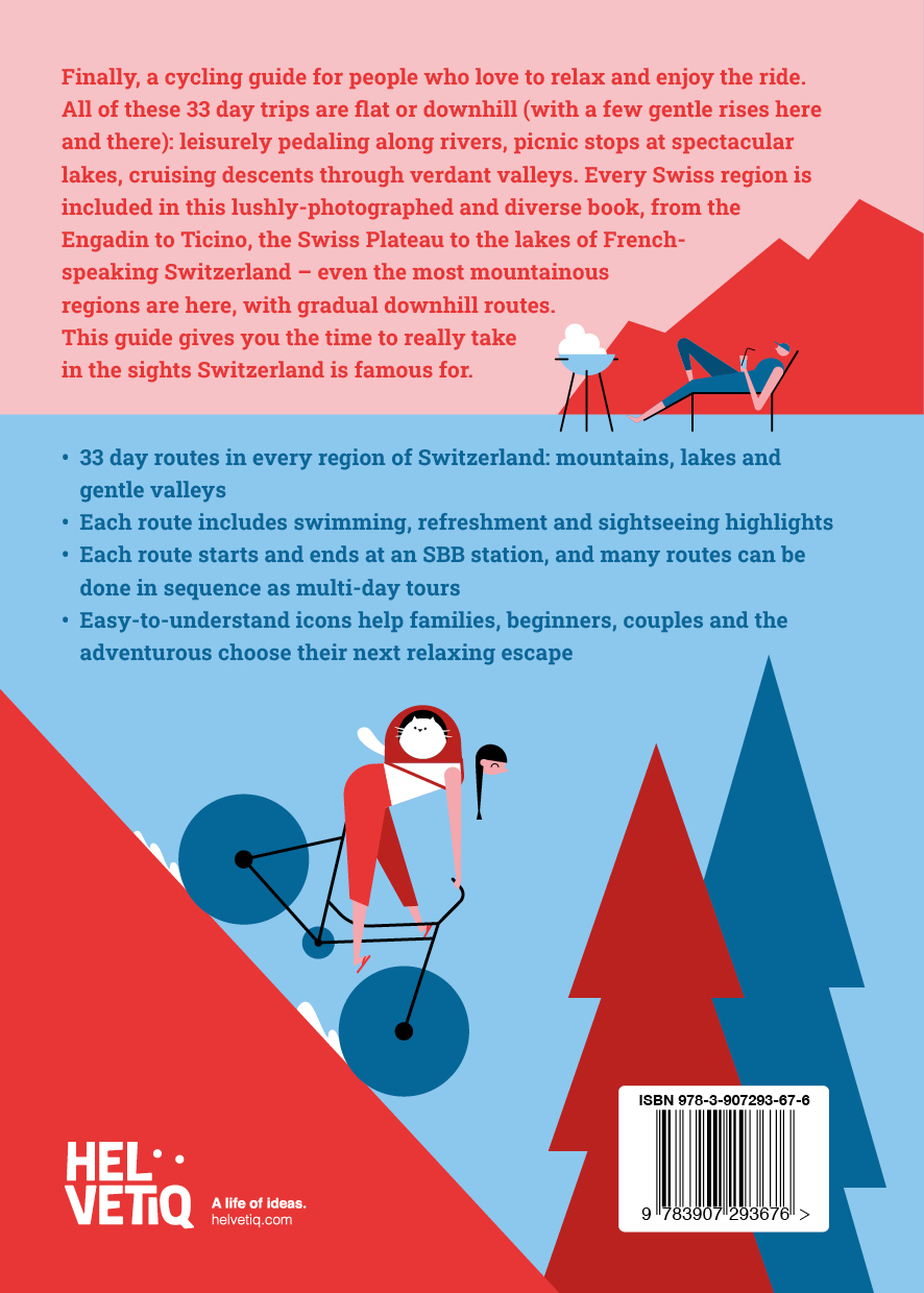 Finally, a cycling guide for people who love to relax and enjoy the ride. All of these 33 day trips are flat or downhill (with a few gentle rises here and there): leisurely pedalling along rivers, picnic stops at spectacular lakes, cruising descents through verdant valleys. Every Swiss region is included in this lushly-photographed and diverse book, from the Engadin to Ticino, the Swiss Plateau to the lakes of French-speaking Switzerland - even the most mountainous regions are here, with gradual downhill routes. This guide gives you the time to really take in the sights Switzerland is famous for.33 day routes in every region of Switzerland: mountains, lakes and gentle valleysEach route includes swimming, refreshment and sightseeingEach route starts and ends at an SBB station, and many routes can be done in sequence as multi-day tours.Easy-to-understand icons help families, beginners, couples and the adventurous choose their next relaxing escape.