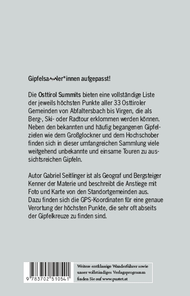 Gipfel sammeln in OsttirolMan mag meinen: Ein Bergbuch über Osttirol zu schreiben sei wie Eulen nach Athen zu tragen. Doch weit gefehlt! Neben den bekannten und viel begangenen Gipfelzielen wie dem Großglockner und dem Hochschober finden sich in dieser umfangreichen Sammlung aller Gemeindesummits Osttirols viele weitgehend unbekannte und einsame Berg- und Skitouren zu aussichtsreichen Gipfeln. So gehören die höchsten Punkte von St. Johann im Walde, Dölsach, Assling oder Untertilliach zu jenen, die in anderen Tourenführern kaum beschrieben und auch wenig begangen werden. Und an dem höchsten Punkt der Gemeinde Lienz, auf dem Weg von der Hochsteinhütte zum Hochstein, einem eigentlich vielbesuchten Berg, laufen die meisten vorbei.Die "Osttirol Summits" bieten eine vollständige Liste der jeweils höchsten Punkte aller 33 Osttiroler Gemeinden, die als Berg-, Skioder Radtour erklommen werden können. Damit füllt dieser Bergtourenführer in komprimierter Form eine Wissenslücke und ist so ein Muss für Gipfelsammler*innen!- 75 Wander-, Rad- und Skitouren- niedrigster Summit in Osttirol bereits auf über 2000 Metern