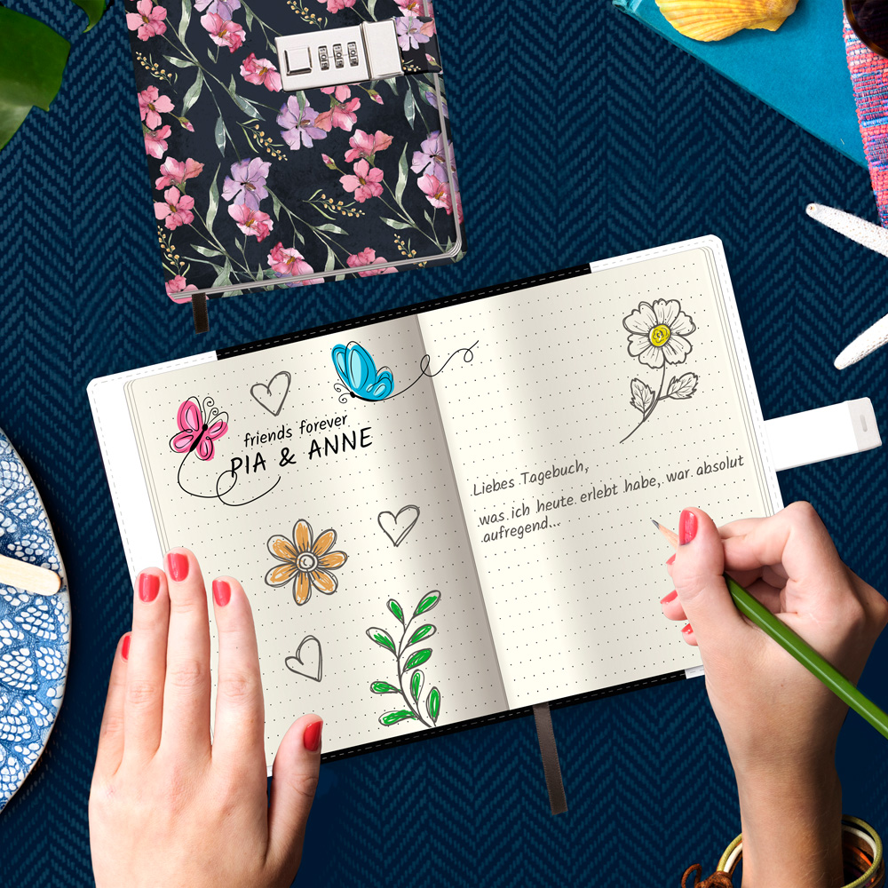 Das Tagebuch im charmanten Blumen-Design eignet sich perfekt, um Gedanken und Gefühle niederzuschreiben und zu ordnen. Die gepunkteten Seiten eignen sich besonders gut für eine individuelle Gestaltung, während ein Schloss mit Zahlencode dafür sorgt, dass alle Geheimnisse sicher sind. Eine schöne Geschenkidee für viele Anlässe!