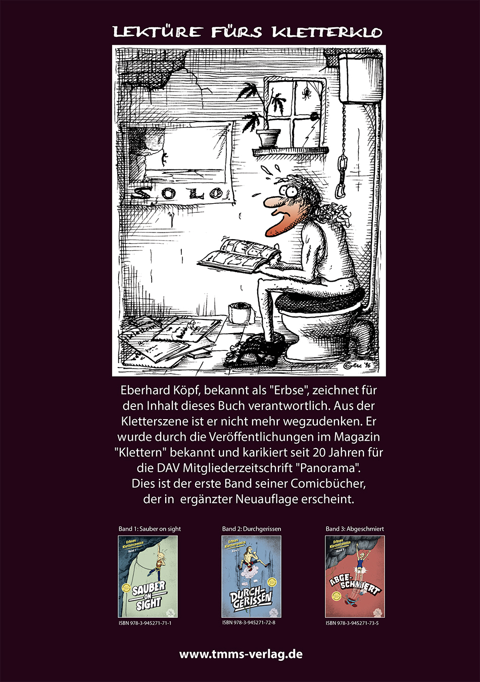 Eberhard Köpf, bekannt als "Erbse", zeichnet für den Inhalt dieses Buch verantwortlich. Aus der Kletterszene ist er nicht mehr wegzudenken. Er wurde durch die Veröffentlichungen im Magazin "Klettern" bekannt und karikiert seit 20 Jahren für die DAV Mitgliederzeitschrift "Panorama".Dies ist der erste Band seiner Comicbücher, der in ergänzter Neuauflage erscheint.