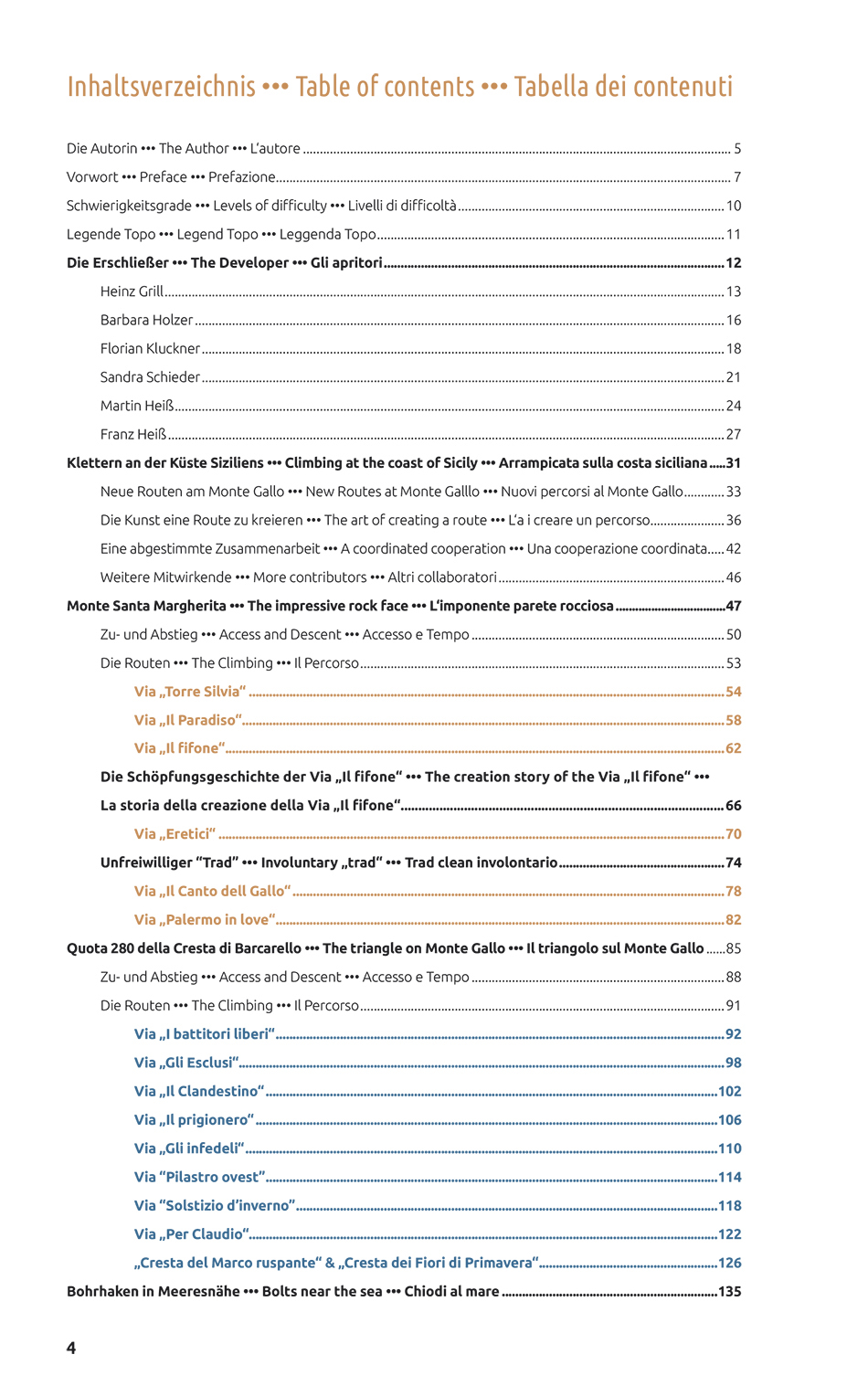 Am Monte Gallo, einem Massiv beim gleichnamigen Kap das durch mehrere Gipfeln geprägt ist, sind in letzter Zeit besonders schöne und lange alpine Mehrseillängenrouten entstanden. Die Routen zeichnen sich durch Längen von 100-300 m Höhe aus und liegen in den Schwierigkeitsgraden 5b bis 6c (mit Schwerpunkt 6a).Eingerichtet wurden sie von Heinz Grill, Florian Kluckner sowie deren Freundeskreis. Das ist das Team, welches auch die besonders schönen Routen rund um Arco begangen hat.Der Führer gibt ausführliche Informationen zu den Routen am Monte Gallo. Fotos vermitteln einen Eindruck von der Kletterei und Informationen zu den Erstbegehern die dem Kletterinfos vorangestellt sind, zeugen von der Hochachtung gegenüber den Erschließern und zeigen deren geistige Haltung gegenüber ihren Erschließungen auf.