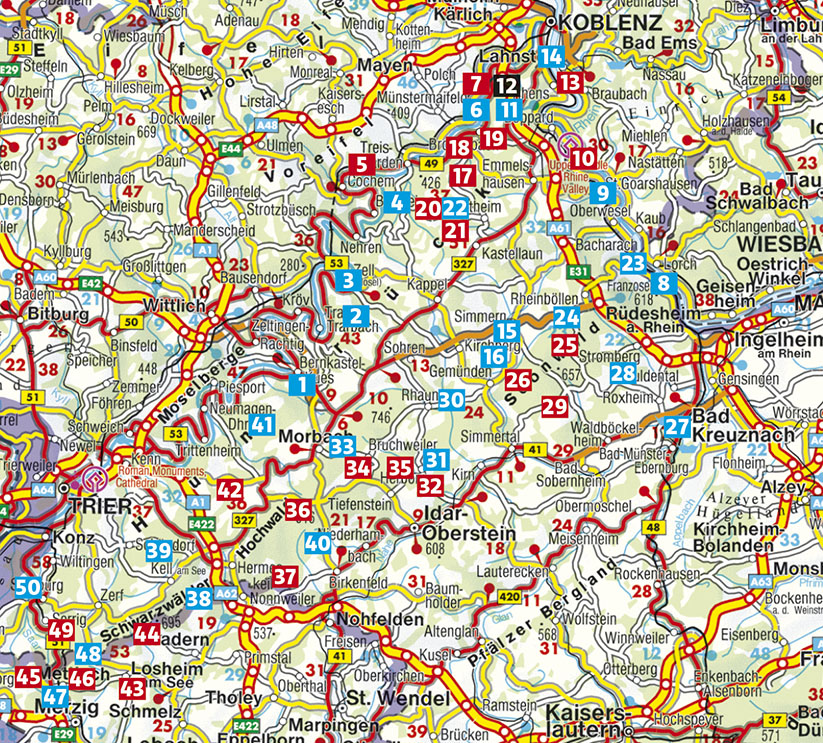 Die Wanderungen führen auf aussichtsreiche Berge und durch Auenlandschaften, es geht durch Weinberge und Wälder, vorbei an stillen Seen und zu romantischen Burgen. Faszinierend sind die Tiefblicke auf grandiose Flusslandschaften im Rhein-, Mosel- oder Saartal. Auch der Nationalpark »Hunsrück-Hochwald« hält hochkarätige Touren bereit. In berühmten Weinorten und hübschen Fachwerkdörfern locken Gaststätten zur gemütlichen Einkehr. Einfache Routen für Genusswanderer überwiegen, einige Touren sind jedoch durchaus anspruchsvoller und bieten sogar kleine Kletterpassagen.