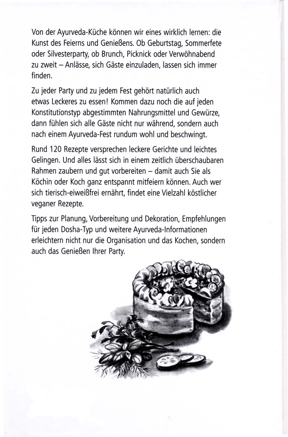 Rund 120 vegetarische und vollwertige Rezepte, passend zusammengestellt in 15 Menüs für das ganze Jahr, versprechen leckere Gerichte und leichtes Gelingen. Kommt dazu noch eine auf jeden Konstitutionstyp abgestimmte Kombination der Nahrungsmittel und Gewürze beim Kochen, dann fühlen wir uns nicht nur während, sondern auch nach einem Fest rundum wohl und beschwingt.