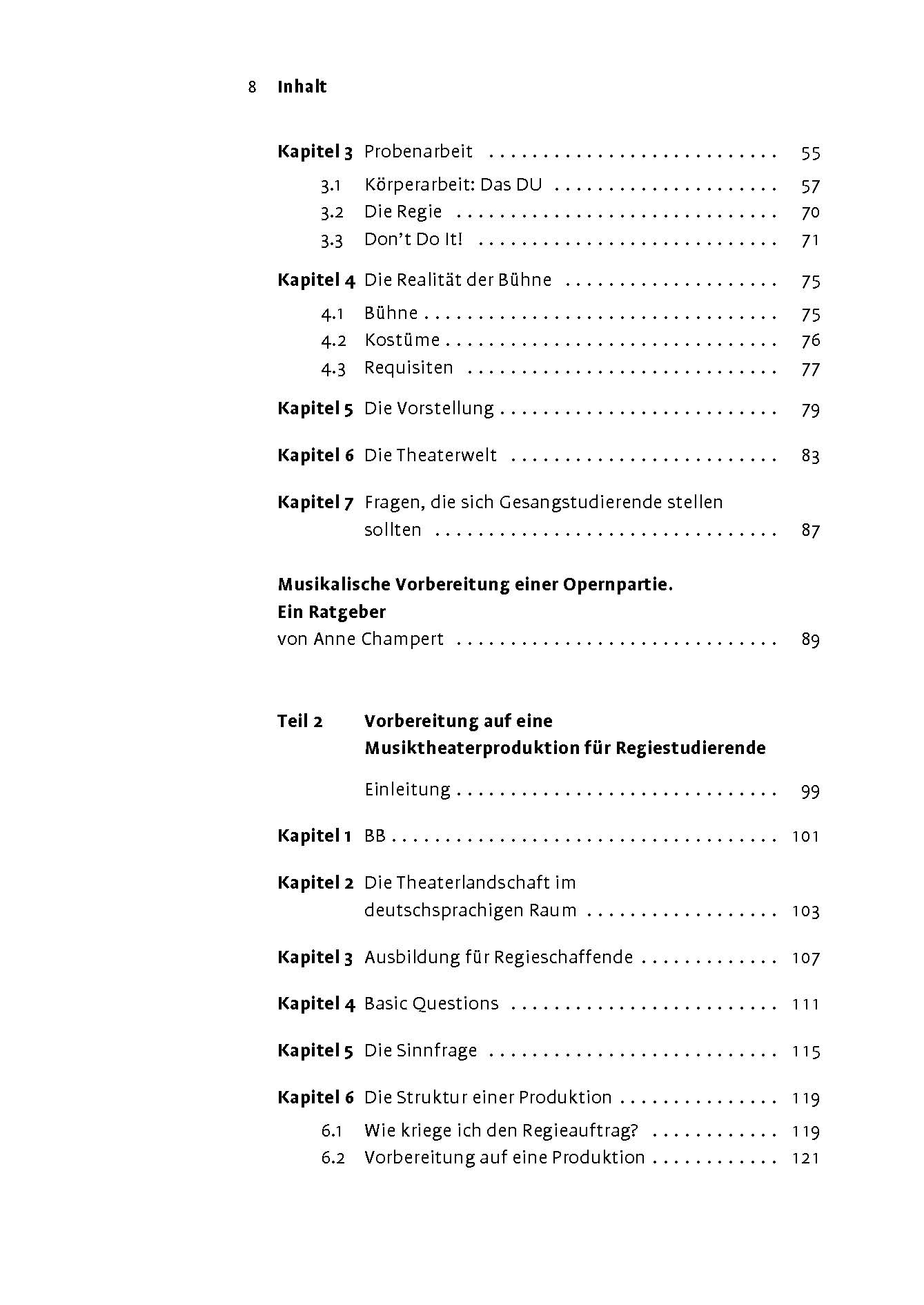 Die Oper ist eine gnadenlose Geliebte. In den besten Momenten erleben wir sie als die absolute Vollendung der Bühnenkünste - in den schlimmsten als ein menschenfressendes Monster, das alle ausspuckt, die ihren höchsten Ansprüchen nicht genügen. Trotzdem stürzen sich jedes Jahr aufs Neue junge Menschen bereitwillig in das Risiko Oper. Um diesen Waghalsigen den schwierigen Sprung vom Studium auf die Bühne zu erleichtern, hat Beverly Blankenship das vorliegende Handbuch geschrieben. Die Autorin setzt den anfangs überwältigenden Herausforderungen des Musiktheaters Klarheit und Struktur entgegen: vom schauspielerischen Impuls bis zur gründlichen Analyse, von grundlegenden ästhetischen Fragen bis hin zum vermeintlich banalen Theateralltag. Das Buch richtet sich gleichermaßen an Gesang- und Regiestudierende, die so einen umfassenden Leitfaden für ihre eigene Arbeit erhalten, aber auch Einblick in die Aufgaben und Bedürfnisse der jeweils anderen Seite.Beverly Blankenship fördert und fordert die Kreativität der Studierenden, vor allem aber stellt sie ihnen Fragen:?Wie entfesselt man das Bühnentier in sich??Wie geht das: singen und sich gleichzeitig bewegen??Wie plant man eine Szene mit 150 Darstellenden??Wie können Philosophie, Bühnenmagie und Regiehandwerk zu einem besonderen Opernereignis verschmolzen werden??Sind Theaterleute seicht wie eine Pfütze oder tief wie das Meer? Und - ist das wichtig? Beverly Blankenship stammt aus einer Familie von OpernsängerInnen. Sie arbeitet als Regisseurin, Schauspielerin und Autorin und lehrt seit vielen Jahren an Universitäten rund um die Welt. Ihr Ziel: kreative, feurige, beseelte und eigenverantwortliche SängerInnen und RegisseurInnen im Opernbetrieb.Anne Champert, Komponistin, Pianistin, Vocalcoach, 2005-2014 Studienleiterin an der Deutschen Oper Berlin, ist Professorin für Partienstudium und Opernkorrepetition an der Hochschule für Musik, Theater und Medien in Hannover. Mit online abrufbaren Videos, hier geht's zum Trailer: https://doi.org/10.5446/55227