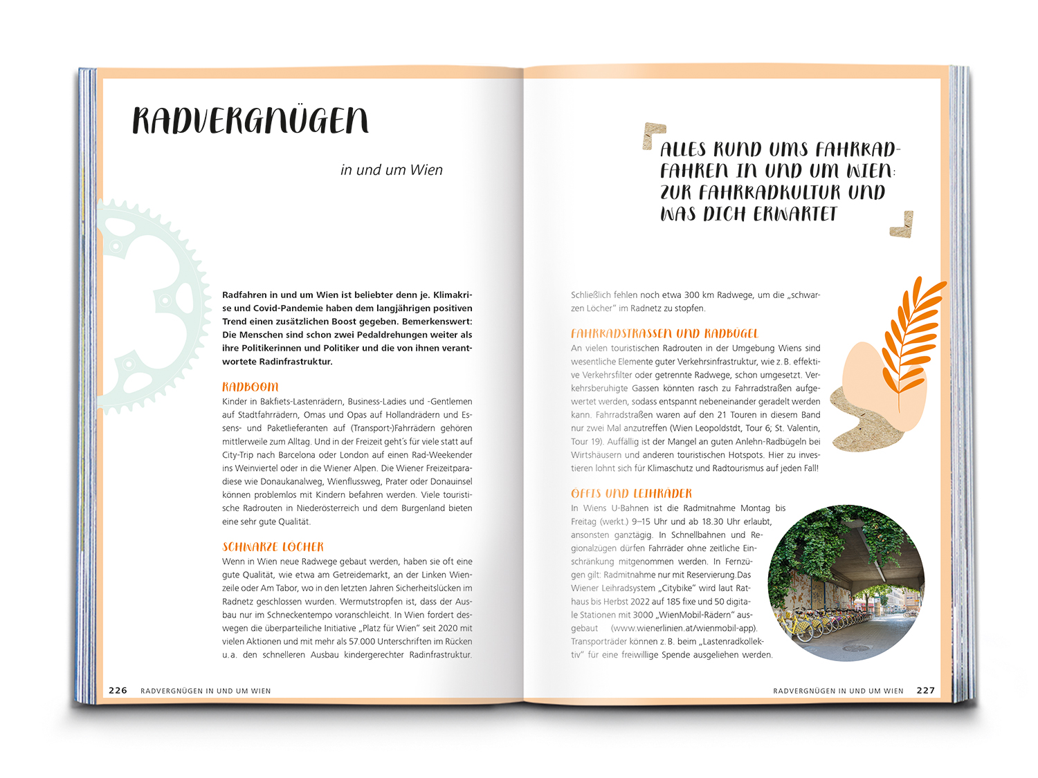 Tagestouren, die jeder schafft, Feierabendrunden zum Runterschalten und Wochenendausflüge ins Umland - hier ist für alle die passende Tour dabei. Du entdeckst das orientalische Wien, gehst zwischen Napoleonmuseum und Seestadt Aspern auf Zeitreise, machst eine Filmtour oder radelst zum Plane-Spotting beim Flughafen. Im Helenental gibt's kaiserliche Romantik, im Weinviertel Bahntrassenradeln und entlang Traisen und Donau Barockarchitektur und Badefreuden.
