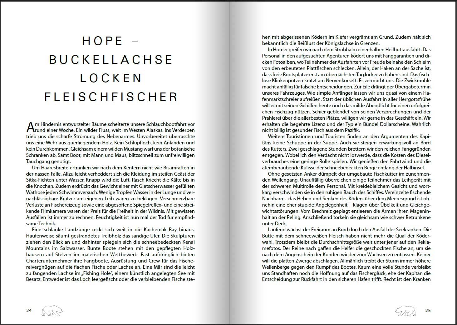 „Kein Rentier ist so blöde, in dieser gottlosen Weite und Öde als vierbeiniger Blutspender umherzulaufen. Nur wir abenteuersüchtigen Taimenfischer, samt russischer Begleitagentur, schlagen uns durch die Insektenschwärme.“ (Gottlieb Eders Erkenntnis am Polarkreis) „Ich habe einen! Das Vieh reißt mir das Leihzeug kaputt. Hilfe, so helft mir doch!“ Tom ist kein Fischer. Er ist ein leidenschaftlicher Niederwildjäger und Heger seines bayrischen Reviers. Mehr Wert ist ihm die Pirsch als der geile Schuss. Als Anfänger des nassen Weidwerkes braucht er unsere Hilfsbereitschaft und Ratschläge. Immer wieder kämpft er mit der Technik der Rollenfunktion. Statt den schweren Blinker in das Zielgebiet des Schwarmes zu werfen, fliegt uns das scharfe Eisen förmlich um die Ohren. Abgelenkt von den springenden Silberpfeilen, vergisst er immer wieder auf das Öffnen des Schnurfangbügels oder verstrickt sich heillos im Gewirr der geschlagenen Perücken. Mit schwindender Geduld ertragen wir die vielfältigen Pannen seiner Lernphase. Knoten entwirren, Leine kappen, Wirbel und Blinker anbinden sowie Lachse bändigen, das stiehlt in gewisser Hinsicht eigene Fischerzeit. Geradezu mit der Präzision eines Scharfschützen trifft er in unregelmäßigen Abständen die einzige abgesoffene Baumleiche und hängt bombenfest. Einem Eisberg gleich ragt ein dicker Ast als Warnung aus dem Wasser und die Ausdehnung unter der Oberfläche lässt sich nur auf Grund der zahlreichen Treffer vermuten. Von dem Hochgefühl seines Fangrausches getrieben, versenkt Tom ungeniert beinahe den halben Bestand seiner Spinnködersammlung. Es versteht sich von selbst, dass die Nachbarschaftshilfe jenen trifft, der am nächsten in Toms Arbeitsfeld verweilt. Im Laufe der unterhaltsamen Fischerei vergrößern sich die Abstände zum blutigen Anfänger. Zunehmend muss er sich selbst mit den hausgemachten Problemen auseinandersetzen. Und nun hat der Glückspilz tatsächlich den ersten Silberlachs am Haken! Rücksichtslos schleift er den Fisch über den Kieselstreifen des flachen Ufers. Unbekümmert, wie halt so Neueinsteiger sind, macht er sich nicht die geringsten Sorgen. Walter eilt im Sturmschritt zur abgelegten Filmkamera, um die Heldentat des glücklichen Mannes für die Nachwelt festzuhalten. In der Zwischenzeit suche ich mir aus dem vorbereiteten Feuerholzhaufen einen handlichen Schwemmholzknüppel, um den Leidenskampf des Silvers noch vor dem Ausdrehen des Hakens zu beenden. An Ort und Stelle bleibt der Totschläger später liegen, denn auch wir wollen das Fanglimit von drei Stück pro Lizenznehmer nützen. „Hi, hi, hiiii!“, schreit Tom vor Vergnügen wie ein Verrückter. „Ist das ein Königslachs?“, meint er, von der Größe völlig überrascht, im urigen Dialekt. „Fahre mit den Fingern hinter den Kiemendeckel und halte ihn hoch!“, gibt Walter die Regieanweisung, um beide in das rechte Licht der Schmalfilmkamera zu rücken. Kläglich scheitert der erste Versuch durch die lebhafte Gegenwehr des Fisches. Um uns sein Petri Heil eindrücklich zu beweisen, reißt er das Schuppenwild – immer noch steckt der Bogen eines Drillings im Zahnfleisch des Tieres – mit einem Urschrei auf Augenhöhe. Nicht gefallen lässt sich der lebendige Fisch die Misshandlung. Er krümmt seinen kräftigen Schwanz in Notwehr. Im Reflex lässt der Bändiger das Tier respektlos fallen und schimpft das Opfer: „Kruzifix, der beißt!“, schreit Tom vor Schreck und resigniert nach dem dritten Versuch mit folgenden Worten: „Leck mich am Arsch!“ […] Mit großer Mühe schleife ich das Boot über die grobe Schotterbank am Fluss, um eine bequeme Unterlage für mein Kreuz zu finden. Bedacht auf geringste Lärmentwicklung, wechsle ich meine Habseligkeiten vom ersten Schlauchbootstock zur ebenen Erde und liege nun unter dem ungewöhnlichen Regenschutz. Die Umsiedlungsaktion hat meine Lebensgeister wieder wachgerüttelt und die Arbeit der Ausscheidungsorgane angekurbelt. Neuerlich stemme ich einen Bootswulst hoch, um mich unedel unter dem Hindernis ins Freie zu wälzen. Kaum habe ich meine Notdurft außerhalb der Trampelpfade verrichtet, tappe ich in der Finsternis zurück zu meinem Hausboot. Plötzlich fährt mir der Schrecken tief ins Knochenmark. „Ein Bär!“, schreit Tom aufgeregt und steht mit der Pumpgun im Anschlag vor seinem Zelt. Direkt auf mich gerichtet ist der Lauf. Schemenhaft ist die Bewegung des Scharfschützen. In meiner Angst überschlägt sich schier meine Stimme: „Spinnst du, ich bin kein Schwarzer!“ Heftig fuchtle ich mit beiden Armen in der Luft und beende schließlich den Fehlalarm. Genug Treiber hat anstelle von Wildsauen ein unüberlegter Schuss verletzt oder gar getötet. Beim Silberlachsfischen in Alaska möchte ich nicht durch die Kugel eines Greenhorns sterben.