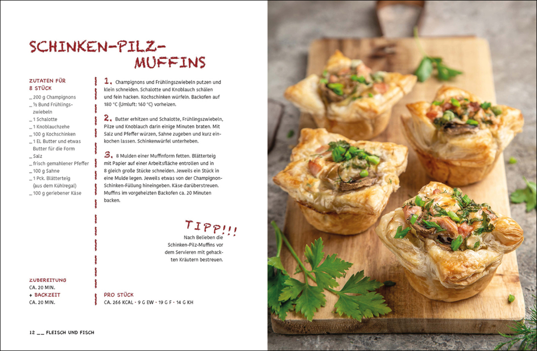 Ob herzhaft oder süß, zum Knabbern oder fürs Familienessen - aus Blätterteig lassen sich die köstlichsten Gerichte zaubern. Und mit Fertig-Blätterteig aus der Tiefkühltruhe oder dem Kühlregal sind die knusprigen Leckereien ruckzuck zubereitet. Probieren Sie schmackhafte Rezepte mit Fleisch und Fisch wie klassisches Filet Wellington oder eine raffinierte Quiche mit Lachs. Auch Vegetarisches mit viel Gemüse wie Spinat-Schnecken und Brokkoli-Strudel begeistern ohne viel Aufwand. Und als krönenden Abschluss gibt es schließlich süße Verführungen zu entdecken wie Birnen im Blätterteigmantel oder einen feinen Blätterteigstern mit Nussnugatcreme. Verwöhnen Sie sich, Ihre Familie und Ihre Freunde mit unkomplizierten Gerichten für jeden Geschmack.