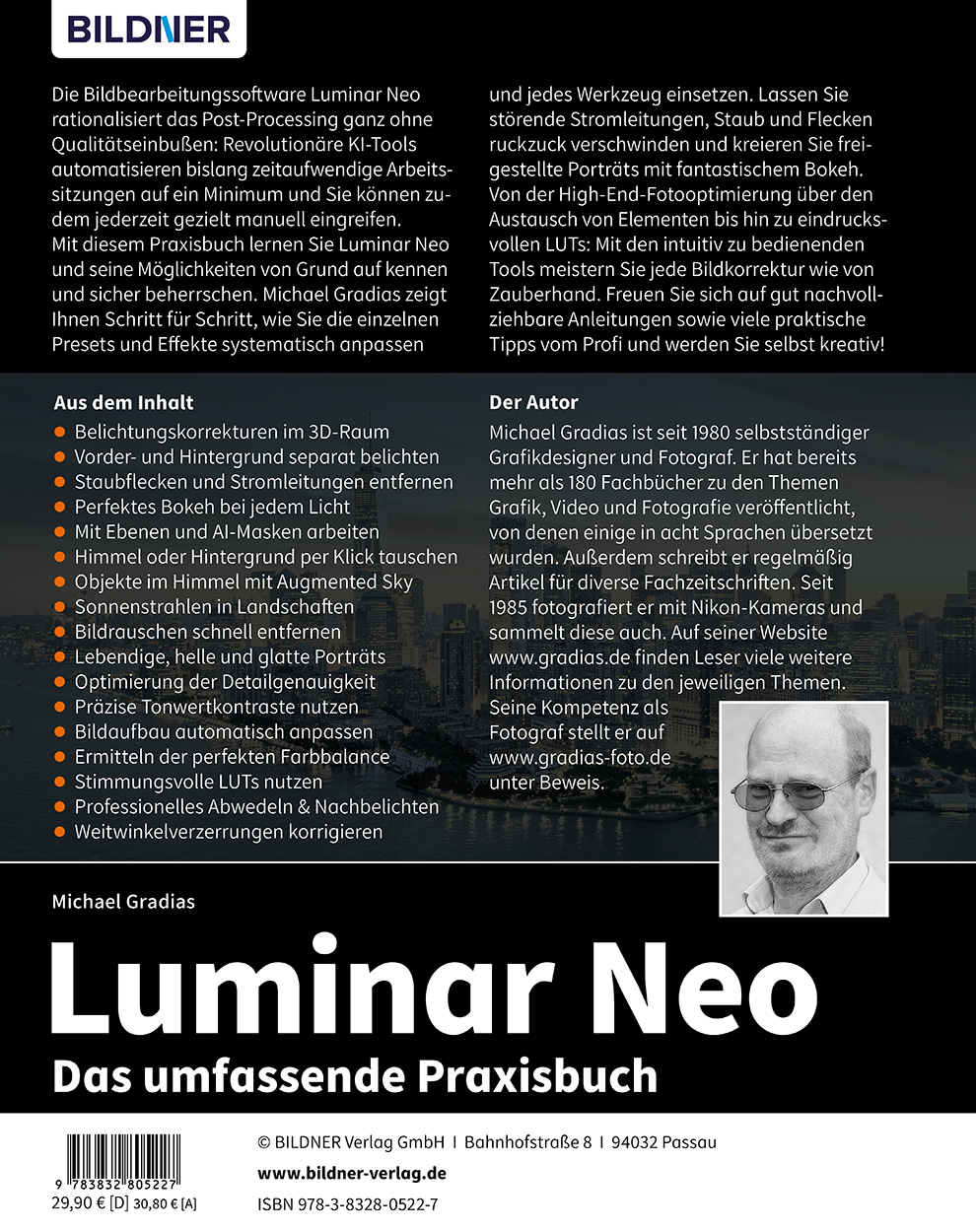 Mit diesem Praxisbuch lernen Sie Luminar Neo und seine Möglichkeiten von Grund auf kennen und sicher beherrschen. Michael Gradias zeigt Ihnen Schritt für Schritt, wie Sie die einzelnen Presets und Effekte systematisch anpassen und jedes Werkzeug einsetzen. Lassen Sie störende Stromleitungen, Staub und Flecken ruckzuck verschwinden und kreieren Sie freigestellte Porträts mit fantastischem Bokeh. Von der High-End-Fotooptimierung über den Austausch von Elementen bis hin zu eindrucksvollen LUTs: Mit den intuitiv zu bedienenden Tools meistern Sie jede Bildkorrektur wie von Zauberhand. Freuen Sie sich auf gut nachvollziehbare Anleitungen sowie viele praktische Tipps vom Profi und werden Sie selbst kreativ!