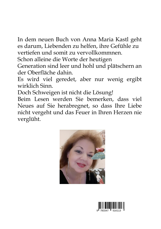 In dem neuen Buch von Anna Maria Kastl geht es darum, Liebenden zu helfen, ihre Gefühle zuvertiefen und somit zu vervollkommnen. Schon alleine die Worte der heutigenGeneration sind leer und hohl und plätschern an der Oberfläche dahin. Es wird viel geredet, aber nur wenig ergibt wirklich Sinn. Doch Schweigen ist nicht die Lösung!Beim Lesen werden Sie bemerken, dass viel Neues auf Sie herabregnet, so dass Ihre Liebe nicht vergeht und das Feuer in Ihren Herzen nie verglüht.