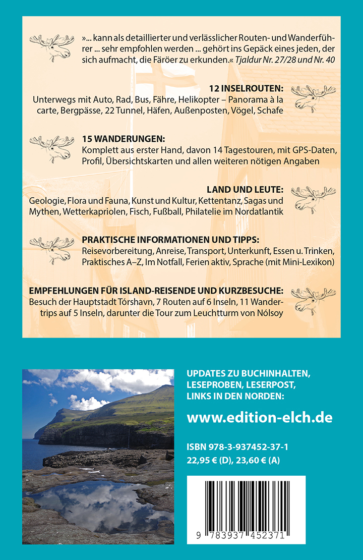 Reiseführer, Wanderführer und Bildband in einem – die Edition Elch hat den einzigen deutschsprachigen Reiseführer mit folgender Themenbreite: Porträt Färöer, 12 Inselrouten, 15 Wanderungen, Praktischer Teil. Plus Empfehlungen für Island-Transitreisende, die sich im Sommer (mit der Fähre kommend) für einen mehrtägigen Färöer-Aufenthalt entscheiden. Zahlreiche eindrucksvolle Fotos werten das gebundene, wetterfeste Buch zusätzlich auf, darunter sind erstmals auch mehrere Bilder aus dem Winterhalbjahr.