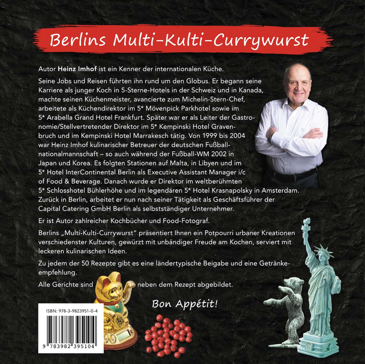 Autor Heinz Imhof ist ein Kenner der internationalen Küche. Seine Jobs und Reisen führten ihn rund um den Globus. Er begann seine Karriere als junger Koch in 5-Sterne-Hotels in der Schweiz und in Kanada, machte seinen Küchenmeister, avancierte zum Michelin- Stern-Chef, arbeitete als Küchendirektor im 5* Mövenpick Parkho- tel und 5* Arabella Grand Hotel Frankfurt. Später war er als Leiter der Gastronomie/Stellvertretender Direktor im 5* Kempinski Hotel Gravenbruch und im Kempinski Hotel Marrakesch tätig. Von 1999 bis 2004 arbeitete Heinz Imhof als kulinarischer Betreuer der deutschen Fußballnationalmannschaft – so auch während der Fußball-WM 2002 in Japan und Korea. Es folgten Stationen auf Malta, in Libyen und im 5* Hotel InterContinental Berlin als Executive Assistant Manager i/c of Food & Beverage. Danach wurde er Direktor im weltberühmten 5* Schlosshotel Bühlerhöhe und im legendären 5* Hotel Krasnapolsky in Amsterdam. Zurück in Berlin, arbeitet er nun nach seiner Tätigkeit als Geschäftsführer der Capital Catering GmbH Berlin als selbstständiger Unternehmer.