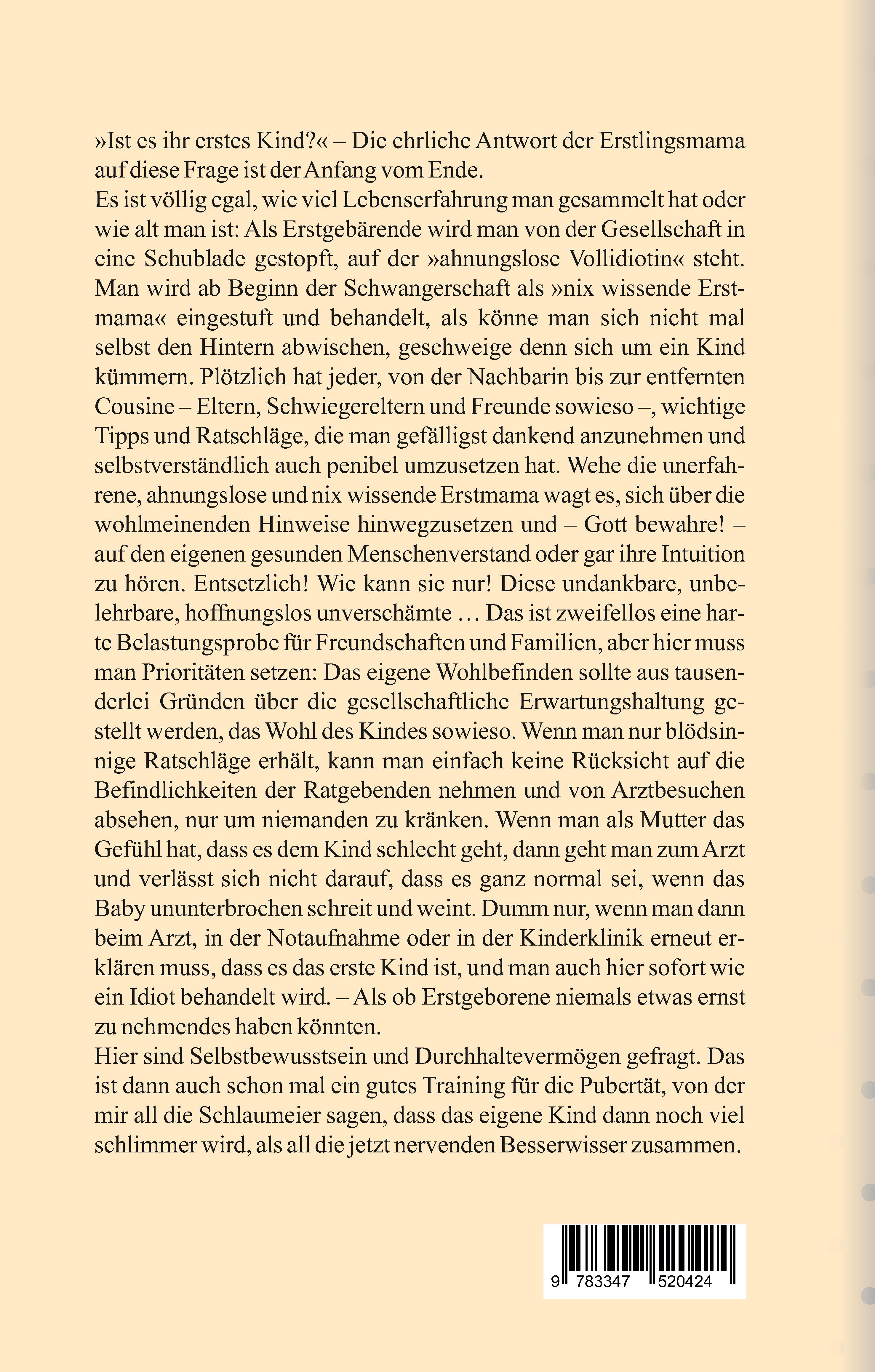 »Ist es ihr erstes Kind?« - Die ehrliche Antwort der Erstlingsmama auf diese Frage ist der Anfang vom Ende. Es ist völlig egal, wie viel Lebenserfahrung man gesammelt hat oder wie alt man ist: Als Erstgebärende wird man von der Gesellschaft in eine Schublade gestopft, auf der »ahnungslose Vollidiotin« steht. Man wird ab Beginn der Schwangerschaft als »nix wissende Erstmama« eingestuft und behandelt, als könne man sich nicht mal selbst den Hintern abwischen, geschweige denn sich um ein Kind kümmern. Plötzlich hat jeder, von der Nachbarin bis zur entfernten Cousine - Eltern, Schwiegereltern und Freunde sowieso -, wichtige Tipps und Ratschläge, die man gefälligst dankend anzunehmen und selbstverständlich auch penibel umzusetzen hat. Wehe die unerfahrene, ahnungslose und nix wissende Erstmama wagt es, sich über die wohlmeinenden Hinweise hinwegzusetzen und - Gott bewahre! - auf den eigenen gesunden Menschenverstand oder gar ihre Intuition zu hören. Entsetzlich! Wie kann sie nur! Diese undankbare, unbelehrbare, hoffnungslos unverschämte ... Das ist zweifellos eine harte Belastungsprobe für Freundschaften und Familien, aber hier muss man Prioritäten setzen: Das eigene Wohlbefinden sollte aus tausenderlei Gründen über die gesellschaftliche Erwartungshaltung gestellt werden, das Wohl des Kindes sowieso. Wenn man nur blödsinnige Ratschläge erhält, kann man einfach keine Rücksicht auf die Befindlichkeiten der Ratgebenden nehmen und von Arztbesuchen absehen, nur um niemanden zu kränken. Wenn man als Mutter das Gefühl hat, dass es dem Kind schlecht geht, dann geht man zum Arzt und verlässt sich nicht darauf, dass es ganz normal sei, wenn das Baby ununterbrochen schreit und weint. Dumm nur, wenn man dann beim Arzt, in der Notaufnahme oder in der Kinderklinik erneut erklären muss, dass es das erste Kind ist, und man auch hier sofort wie ein Idiot behandelt wird. - Als ob Erstgeborene niemals etwas ernst zu nehmendes haben könnten. Hier sind Selbstbewusstsein und Durchhaltevermögen gefragt. Das ist dann auch schon mal ein gutes Training für die Pubertät, von der mir all die Schlaumeier sagen, dass das eigene Kind dann noch viel schlimmer wird, als all die jetzt nervenden Besserwisser zusammen.