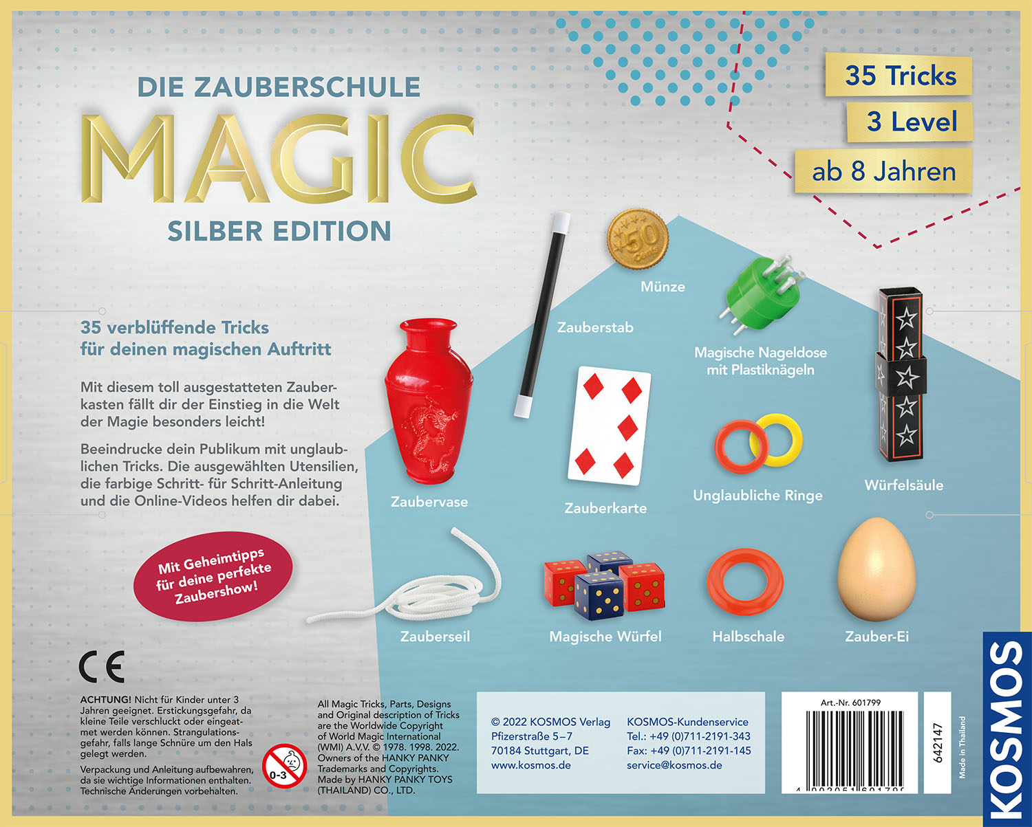 Die ideale Zauberausstattung für den Einstieg in die Welt der Magie - für Zauber-Fans ab 8 Jahren! Inklusive Gutschein für 1 Stunde digitalen Live-Zauberkurs in der Magic School. Mit neuem und innovativem Anleitungskonzept mit vielen und zahlreichen Tipps und Tricks für eine gelungene Zauber-Show. Video-Tutorials zu ausgewählten Tricks. Zaubertricks und Illusionen schulen Feinmotorik, Geduld und Geschicklichkeit. Vorführen vor Publikum trainiert das Selbstbewusstsein. Cooles Geschenk für angehende Magier und Magierinnen ab 8 Jahren. Zaubershow im Kinderzimmer! In diesem Zauberkasten von KOSMOS stecken tolle Utensilien für angehende Magierinnen und Magier. Wie mit Zaubervase, Zauber-Ei, Ringen, Seil, Zauberstab und vielem mehr über 35 geniale Tricks gelingen, zeigt die ausführliche farbige Anleitung. Die vielfältigen Zauberkunststücke sind nach Schwierigkeit sortiert - so gelingt Kindern ab 8 Jahren der Einstieg in die Zauberkunst spielend leicht! Jetzt noch das Publikum auf die Vorführung einstimmen und schon beginnt der große Auftritt. Durch die Zaubervorführung wird das Selbstbewusstsein gestärkt und die Fingerfertigkeit ganz nebenbei trainiert. Die Spannung steigt!