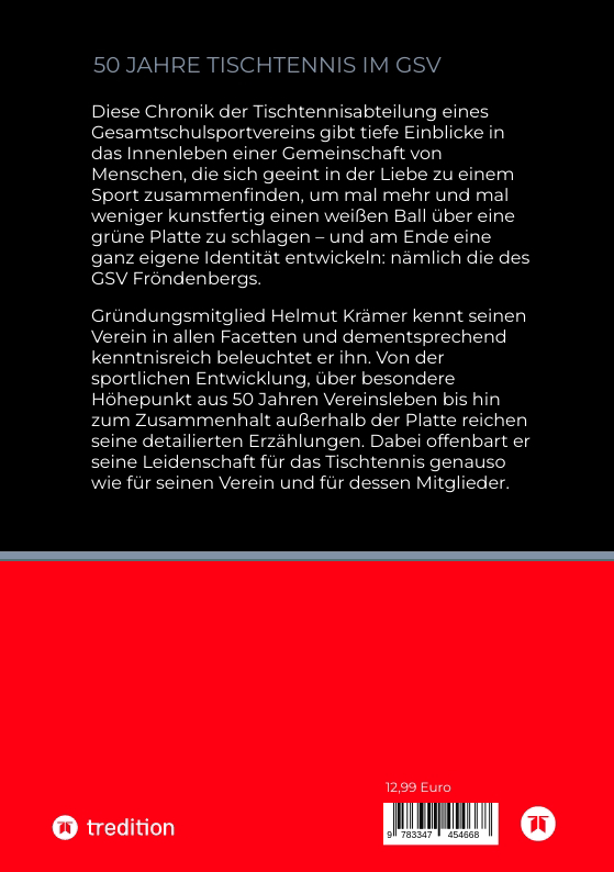 Diese Chronik der Tischtennisabteilung eines Gesamtschulsportvereins gibt tiefe Einblicke in das Innenleben einer Gemeinschaft von Menschen, die sich geeint in der Liebe zu einem Sport zusammenfinden, um mal mehr und mal weniger kunstfertig einen weißen Ball über eine grüne Platte zu schlagen, und am Ende eine ganz eigene Identität entwickeln: nämlich die eines Mitglieds des GSV Fröndenbergs. Gründungsmitglied Helmut Krämer kennt seinen Verein in allen Facetten und dementsprechend kenntnisreich beleuchtet er ihn. Von der sportlichen Entwicklung, über besondere Höhepunkt aus 50 Jahren Vereinsleben bis hin zum Zusammenhalt außerhalb der Platte reichen seine detailierten Erzählungen. Dabei offenbart er seine Leidenschaft für das Tischtennis genauso wie für seinen Verein und für dessen Mitglieder.