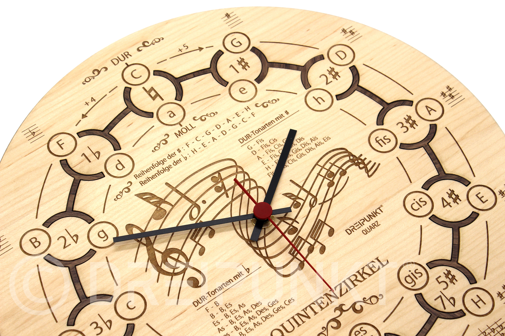 Dieser detaillierte Uhren-Bausatz aus Kirsch-, Ahorn-, Bambus- oder Eichenholz zeigt den Quintenzirkel, Dur- und Moll-Tonarten in einem ansprechenden Design. Durch die Verwendung unterschiedlicher Holzarten entsteht ein großartiger Kontrast und die Uhr wird ein echter Blickfang in jedem Raum.Ein hochwertiges Qualitätsuhrwerk (Quarz) sorgt für eine stets genaue Uhrzeit.Ein tolles Geschenk für jeden Musiker!Durch die Nutzung hochwertiger Hölzer und eine 500dpi Hochkontrast Lasergravur kommen alle Details und Gravuren perfekt zur Geltung.Bitte wähle unten aus, aus welchem Holz das Zifferblatt der Uhr bestehen soll. Die Ornamente bestehen aus Walnussholz.Bitte wähle dabei die gewünschte Größe aus (20,5 bzw. 30cm).Bausatz Inhalt- Bauteile aus Kirsch-, Ahorn-, Bambus- oder Eichenholz sowie Walnussholz (Ornamente)- 1 Grundplatte aus Pappelsperrholz- Exakter Laserschnitt und 500dpi Hochkontrastgravur- 1 Uhrwerk (Quarz) mit Haken zur Wandbefestigung- Bebilderte BauanleitungGröße: Die zusammengebaute Uhr hat einen Durchmesser von ca. 29,9cm bei einer Tiefe von ca. 3,5cm (incl. Uhrwerk). Bei Problemen beim Zusammenbau steht dir unser Modellbau-Team per eMail unter bauberatung@dreipunkt-verlag.de zur Verfügung.Hinweis: Bei dem verwendeten Holz handelt es sich um furniertes MDF für größtmögliche Stabilität.AA-Batterie und Befestigungsmaterial (Dübel etc.) sind nicht enthalten.