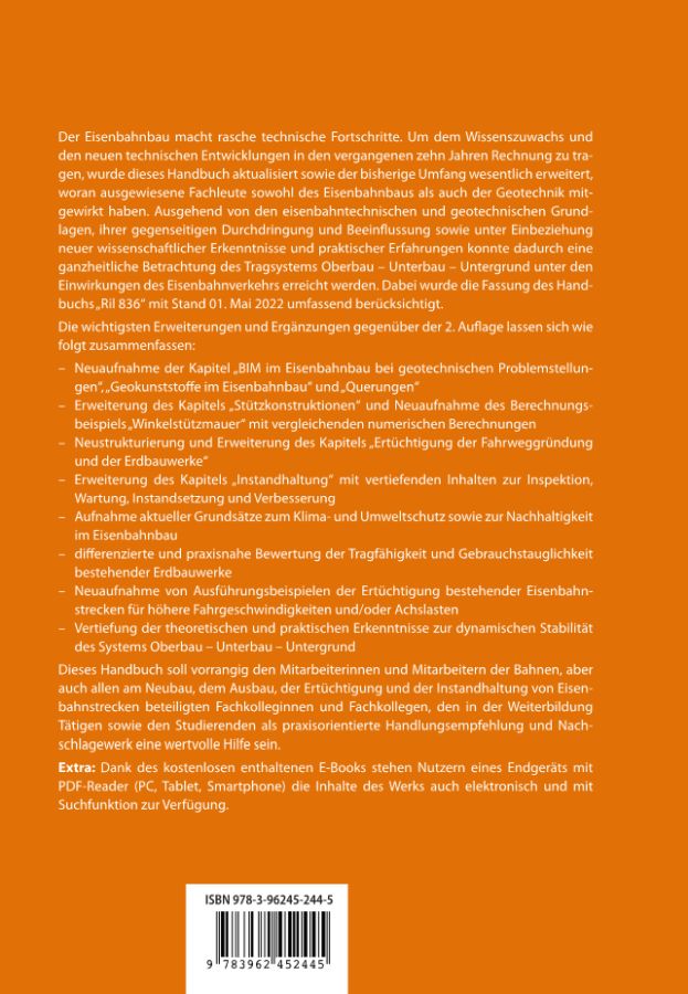 Die 3. komplett überarbeitete und wesentlich erweiterte Neuauflage des Handbuchs „Erdbauwerke der Bahnen“ wurde von ausgewiesenen Fachleuten sowohl des Eisenbahnbaus als auch der Geotechnik geschrieben. Dadurch konnte eine ganzheitliche Betrachtung des Tragsystems Oberbau-Unterbau-Untergrund mit seinen Zusammenhängen und gegenseitigen Abhängigkeiten unter den Einwirkungen der Verkehrsbelastungen erreicht werden.