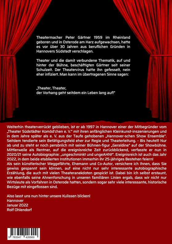 Theatermacher Peter Gärtner 1959 im Rheinland geboren und in Osterode am Harz aufgewachsen, hatte es vor über 30 Jahren aus beruflichen Gründen in Hannovers Südstadt verschlagen. Theater und die damit verbundene Thematik, auf und hinter der Bühne, beschäftigten Gärtner seit seiner Schulzeit. Der Theatervirus hatte ihn gefesselt, nein eher infiziert. Man kann im übertragenen Sinne sagen: „Theater, Theater, der Vorhang geht seitdem ein Leben lang auf!“ Hier in Hannover, zuerst aktiv tätig im „Theater Stattwerk“ im Freizeitheim Stöcken. Dort wirkte er unter der Regie von Dieter Bartels (verst. 12.09.2020) im schauspielerisch experimentellen Genre. Bartels gilt als der Mitbegründer des „TuT - Hannovers Schule für kreative Tanz- und Theaterarbeit“ und der mit seinen Kompagnons, weit über Niedersachsens Grenzen hinaus bekannten und zertifizierten Clownsschule! Diese interessante Zeit prägte Gärtner sehr. Danach sollten noch viele Theaterformen folgen. Wie u. a. volkstümliche, im „Kleinen Hoftheater“ in Hannovers Stadtteil Wülfel. Es blieb, neben seinem Beruf in der Druckvorstufe, zwar ein Hobby und trotz aller zeitlichen Umstände gab es kaum noch ein Privatleben. Dennoch bildete er sich kontinuierlich über den „Bund Deutscher Amateurtheater e.V.“ fort (BDAT wird gefördert von: Die Beauftragte der Bundesregierung für Kultur und Medien.) Seine jahrelange Schauspielerei sollte bald fast enden. Weiterhin theaterverrückt geblieben, ist er ab 1997 einer der Mitbegründer vom „Theater Südstädter Komöd’chen e. V.“! Seitdem tendierte sein Betätigungsfeld eher zur Regie und Theaterleitung. - Bis heute!!! Nur in dem 2010 aus der Taufe gehobenen „Hannoverschen Show Ensemble“ steht er aktuell persönlich mit seiner Bühnenfigur „Geraldine“ auf der Bühne. Mittlerweile als Rentner, auf die ereignisreiche Zeit zurückblickend, verfasste er nun in 2020/21 seine Autobiographie: „ . . . ungeschminkt . . . ungeAHNt“. Als sein künstlerischer Weggefährte, Ehemann und Co-Autor, versichere ich ihnen, dass Sie gewiss auf eine sehr interessante, nicht nur familiäre, nicht nur eine autobiographische Erzählung sondern auch gespannt, hinter unsere Kulissen blicken können! Hannover im November 2021 Rolf Ohlendorf