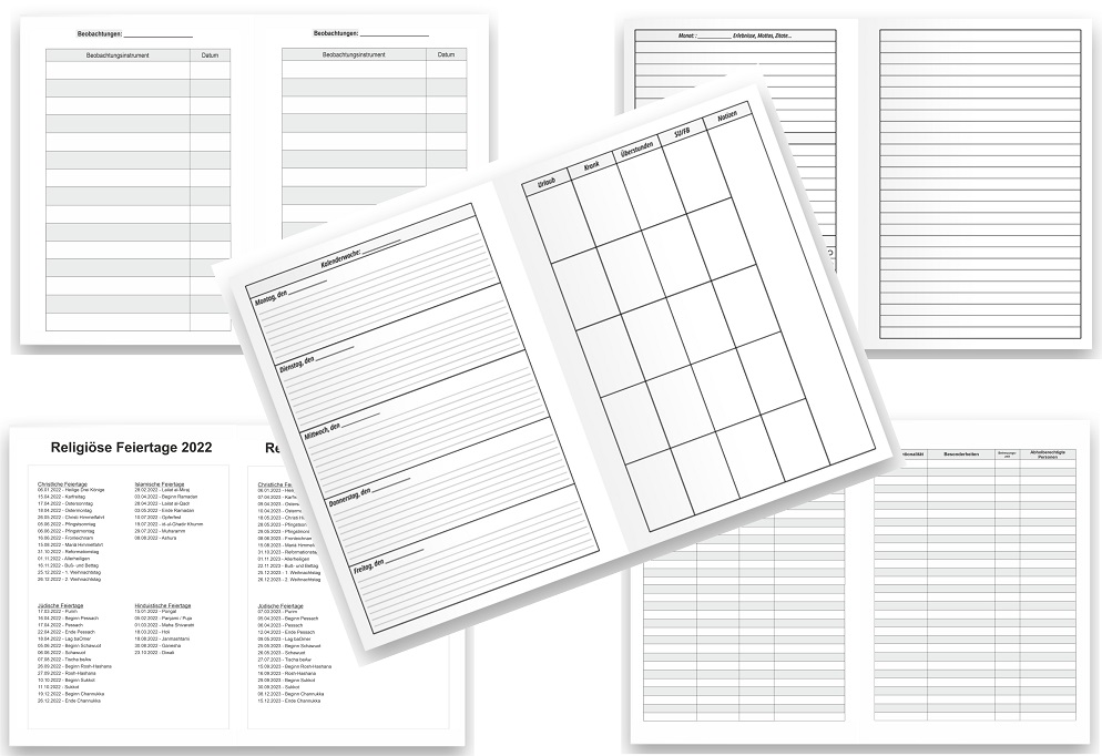 Kita-Planer 2022/23Sie entscheiden, wann Ihr Kalender beginnt:Der Kalender ist ohne feste Monatseintragungen. Sie können ihn von Januar 2022 - März 2023 nutzen oder von August2022 - Oktober 2023.Jede Kalenderwoche ist auf einer Doppelseite dargestellt (inkl. Mitarbeiterübersicht, Notizen und Besprechungen)- stabiler Kalender durch 2 transparente Schutzdeckel- inkl. transparente Tasche, hinten im Kalender für Ihre persönlichen Notizen- DIN A4 Format- 1 Woche auf 2 Seiten- 56 Wochen - 14 Monate- Gruppenlisten mit abholberechtigten Personen- Beobachtungen- Termine- Personal- Erledigungen- Kontakte- Notizen- Schulferien bundesweit 2022 und 2023- interkulturelle Feiertage 2022 und 2023(christliche, islamische, jüdische und hinduistische)- Jahresübersichten 2022 und 2023- Adress-, Telefon- und E-Mail-Verzeichnis- Planungsübersichten