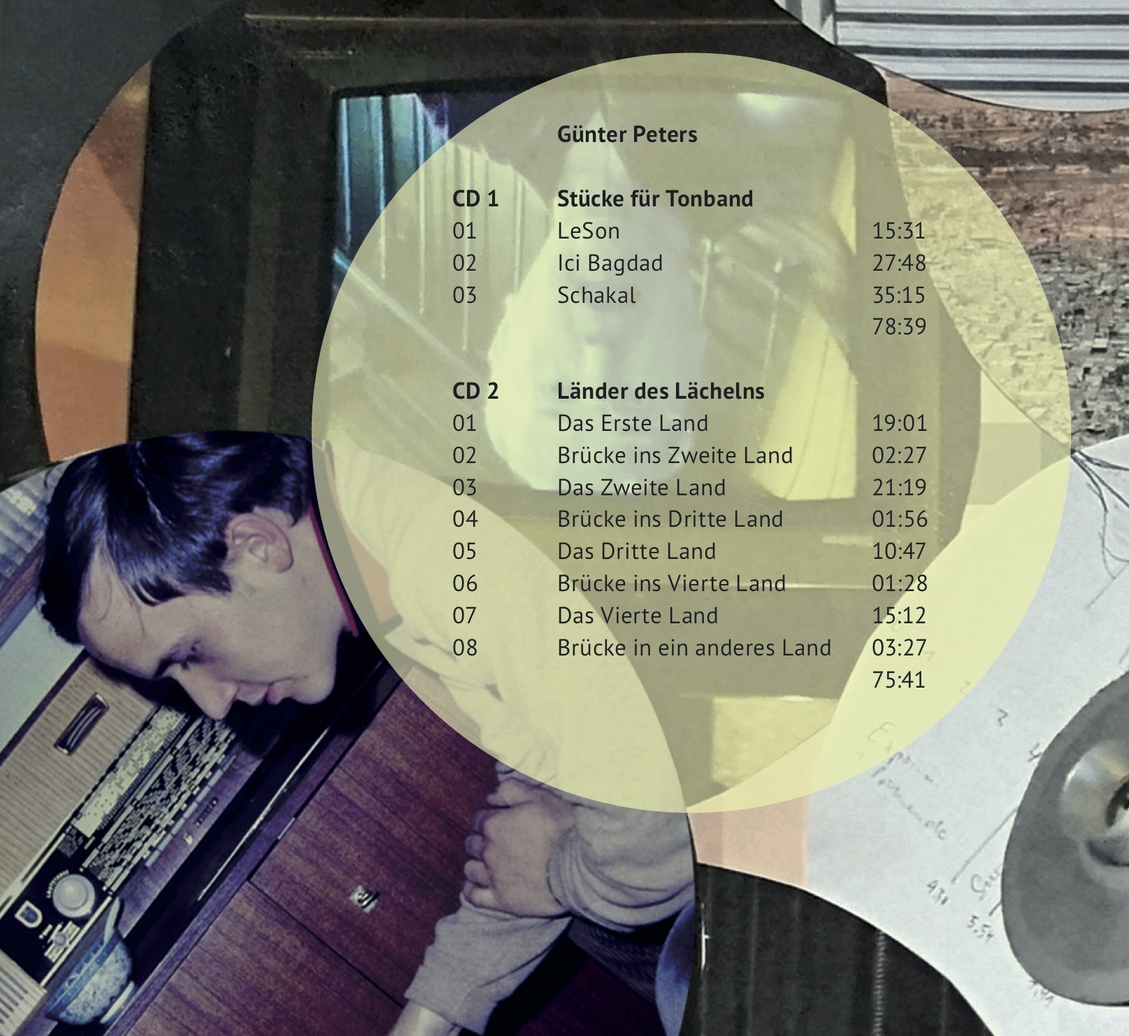 Der Philologe und Melomane Günter Peters (*1947), der sich schon als Jugendlicher auch Erasmus Profanos nannte, präsentiert auf dieser Doppel-CD vier Tonbandkompositionen. "LeSon", "Ici Bagdad" und "Schakal" wurden in jahrzehnteweisen Schüben bis in die Gegenwart hinein aus Klangmaterialien modelliert, die er in den 1960er-Jahren eingespielt hat. Dagegen sind die "Länder des Lächelns" überwiegend aus der ineinander verwobenen und aufeinander projizierten Musik alter Schellackplatten collagiert.