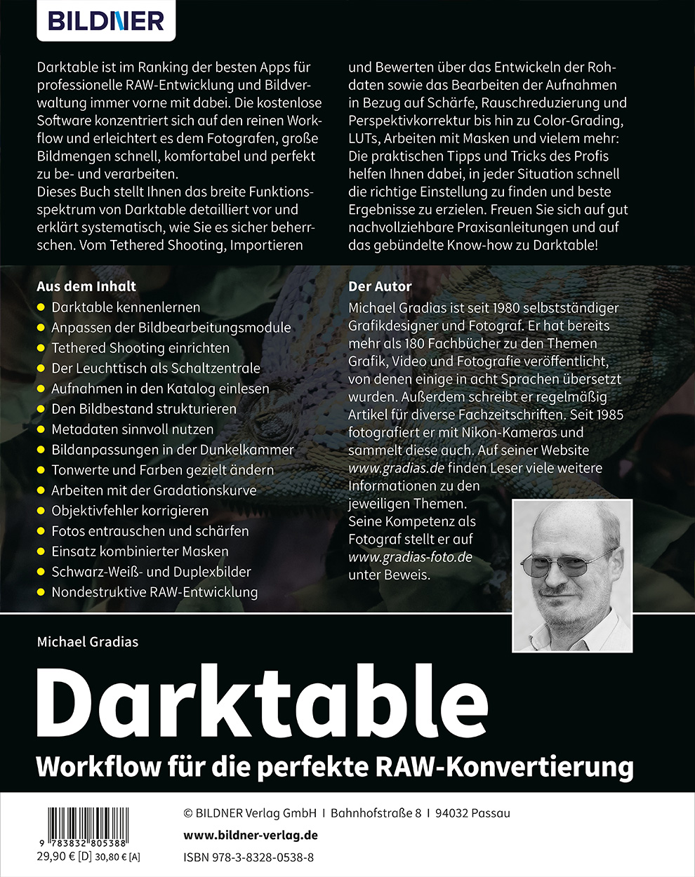 Dieses Buch stellt Ihnen das breite Funktionsspektrum von Darktable detailliert vor und erklärt systematisch, wie Sie es sicher beherrschen. Vom Tethered Shooting, Importieren und Bewerten über das Entwickeln der Rohdaten sowie das Bearbeiten der Aufnahmen in Bezug auf Schärfe, Rauschreduzierung und Perspektivkorrektur bis hin zu Color-Grading, LUTs, Arbeiten mit Masken und vielem mehr: Die praktischen Tipps und Tricks des Profis helfen Ihnen dabei, in jeder Situation schnell die richtige Einstellung zu finden und beste Ergebnisse zu erzielen. Freuen Sie sich auf gut nachvollziehbare Praxisanleitungen und auf das gebündelte Know-how zu Darktable!
