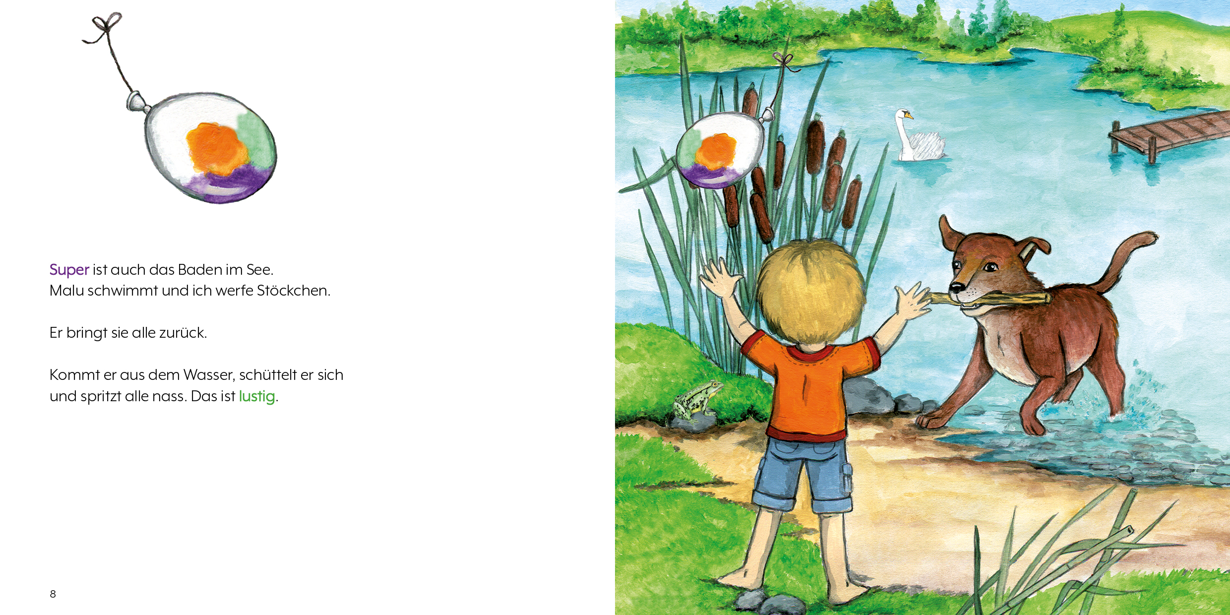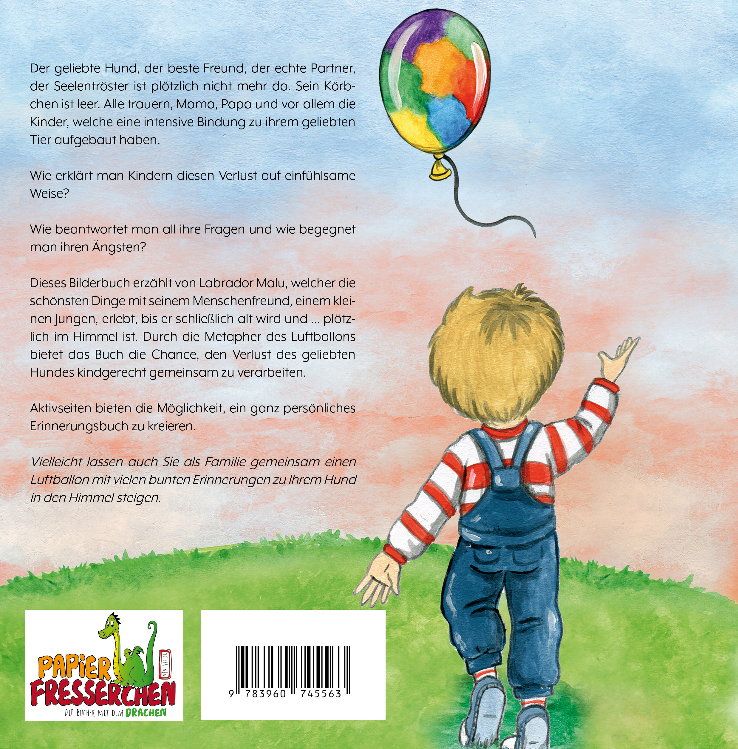 Eine Antwort auf diese Fragen versucht die Sonderpädagogin Christina Grünig zu geben. In ihrem Buch ist es der Hund Malu, der stirbt und einen kleinen Jungen traurig und verzweifelt zurücklässt. Doch durch die Erinnerung an gemeinsame Erlebnisse und die Erkenntniss, dass ihre Freundschaft etwas ganz Besonderes war, schafft es der Junge, Malu loszulassen. Sinnbild dafür ist ein Luftballon, der den Jungen und seinen geliebten Hund das ganze Buch hinweg begleitet und zu guter Letzt in den Himmel aufsteigt.