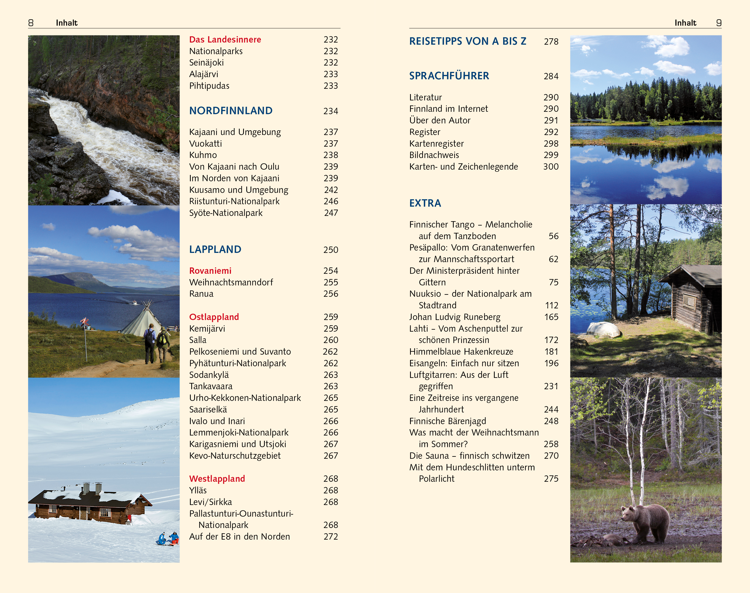 Inhaltsverzeichnis Vorwort 11Herausragende Sehenswürdigkeiten 12Das Wichtigste in Kürze 14Finnland mit Kindern 16Entfernungstabelle 19LAND UND LEUTE 20Finnland: Zahlen und Fakten 22Geologie und Geographie 23Klima 24Mitternachtssonne und Polarnacht 25Fauna 26Flora 28Die Menschen 29Minderheiten 30Sprache 33Religion 35Geschichte 37Erste Spuren 37Finnland und Schweden 37Unter russischer Herrschaft 39Unabhängigkeit 41Zweiter Weltkrieg 43Nachkriegszeit 45EU-Beitritt und Verfassungsreform 45Politik 48Staatsaufbau 48Wirtschaft 48Kunst und Kultur 50Architektur, Malerei und Bildhauerkunst 50Literatur 51Musik 55Film 57Sommerfestivals 58Sport 59Essen und Trinken 63HELSINKI 66Die finnische Hauptstadt 68Stadtgeschichte 68Stadtentwicklung 69Das Zentrum 70Westlich des Zentrums 80Nördlich des Zentrums 82Seurasaari 86Hakaniemi 87Eira 89Festungsinsel Suomenlinna 90Sehenswürdigkeiten am Stadtrand 94Helsinki-Informationen 95Helsinkis Speckgürtel 108Espoo 108Nationalpark Nuuksio 109Vantaa 110SÜDFINNLAND 114Von Helsinki nach Tampere 116Tuusula 116Hyvinkää und Riihimäki 119Hämeenlinna 120Hattula 122Iittala und Sääksmäki 123Tampere 124Stadtrundgang 124Außerhalb des Zentrums 129Ausflüge in die Umgebung 131Turku 132Geschichte 132Sehenswürdigkeiten im Zentrum 133Die Inselwelt vor der Küste Turkus 142Naantali 142Askainen und Nousiainen 145Uusikaupunki 145Das Glasdreieck 146Die Åland-Inseln 148Geschichte 148Natur 151Rundfahrt auf den Åland-Inseln 151Die Südküste von Turku bis Helsinki 156Salo 156Mathildedal 156Ekenäs 156Hanko 157Raseborg und Fagervik 157Fiskars 158Lohja 158Von Helsinki zur russischen Grenze 159Porvoo 159Loviisa 161Kotka 161Hamina 162DIE SEENPLATTE 166Lahti 169Sehenswürdigkeiten 169Die Umgebung von Lahti 174Jyväskylä 175Alle Alvar-Aalto-Gebäude in Jyväskylä 177Stadtrundgang 178Die Umgebung von Jyväskylä 180Auf dem Weg nach Ostfinnland 182Mikkeli 182Varkaus 183Kouvola und Umgebung 184Lappeenranta 185Sehenswürdigkeiten 185Imatra 187Die Umgebung von Imatra 189Savonlinna 190Kerimäki 193Punkaharju 194Nationalpark Linnansaari 195Sulkava 195Joensuu 198Sehenswürdigkeiten 198Outokumpu 199Klöster Uusi Valamo und Lintula 199Kitee 200Ilomantsi 200Möhkö 201Eine Rundfahrt um den Pielinen-See 202Vuonislahti 202Lieksa 202Nurmes 203Nunnanlahti 203Koli-Berge 204Wandern in der Region Valtimo 204Kuopio 205Sehenswürdigkeiten 205Etelä-Konnevesi-Nationalpark 208Wasserfall Korkeakoski 209Iisalmi und Sonkajärvi 209WESTFINNLAND 210Die Westküste 213Rauma 213Von Rauma nach Pori 216Pori 217Die Umgebung von Pori 218Sideby 218Kristinestad 219Von Kristinestad nach Vaasa 220Vaasa 222Von Vaasa nach Oulu 224Oulu 227Das Landesinnere 232Nationalparks 232Seinäjoki 232Alajärvi 233Pihtipudas 233NORDFINNLAND 234Kajaani und Umgebung 237Vuokatti 237Kuhmo 238Von Kajaani nach Oulu 239Im Norden von Kajaani 239Kuusamo und Umgebung 242Riistunturi-Nationalpark 246Syöte-Nationalpark 247LAPPLAND 250Rovaniemi 254Weihnachtsmanndorf 255Ranua 256Ostlappland 259Kemijärvi 259Salla 260Pelkoseniemi und Suvanto 262Pyhätunturi-Nationalpark 262Sodankylä 263Tankavaara 263Urho-Kekkonen-Nationalpark 265Saariselkä 265Ivalo und Inari 266Lemmenjoki-Nationalpark 266Karigasniemi und Utsjoki 267Kevo-Naturschutzgebiet 267Westlappland 268Ylläs 268Levi/Sirkka 268Pallastunturi-Ounastunturi-Nationalpark 268Auf der E8 in den Norden 272REISETIPPS VON A BIS Z 278SPRACHFÜHRER 284Literatur 290Finnland im Internet 290Über den Autor 291Register 292Kartenregister 298Bildnachweis 299Karten- und Zeichenlegende 300EXTRAFinnischer Tango - Melancholie auf dem Tanzboden 56Pesäpallo: Vom Granatenwerfen zur Mannschaftssportart 62Der Ministerpräsident hinter Gittern 75Nuuksio - der Nationalpark am Stadtrand 112Johan Ludvig Runeberg 165Lahti - Vom Aschenputtel zur schönen Prinzessin 172Himmelblaue Hake
